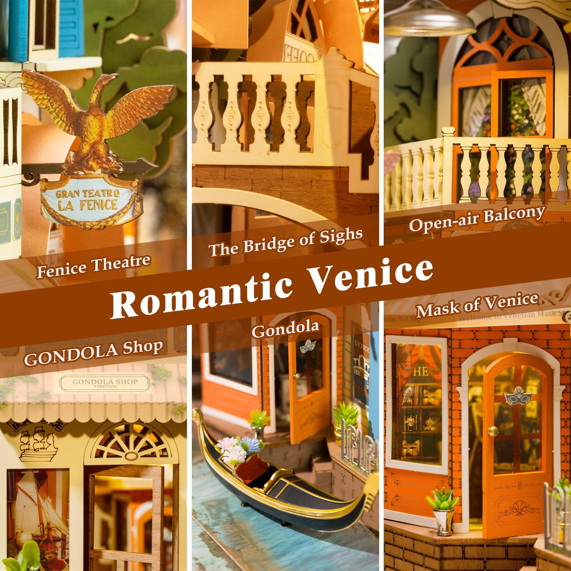rowood book nook DIY Dollhouse Booknook Miniature Kit Rowood Book Nook Kit,DIY Book Nook Kits with Dust Cover for Adults,Miniature House 3D Wooden Puzzle Bookend Bookshelf Insert Craft Kits for Adults/Kids,Birthday Christmas Gifts-Romantic Venice