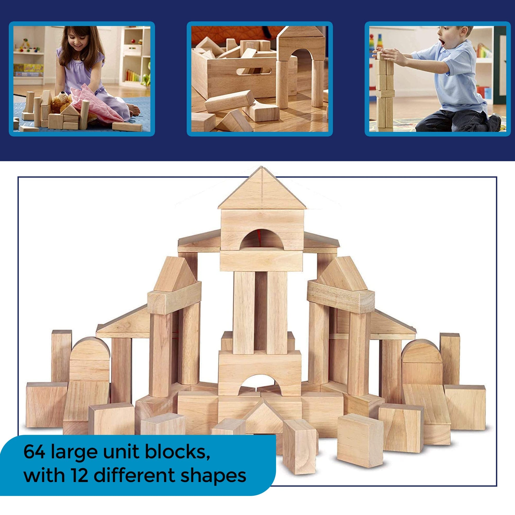 MOD Complete Original Solid Wood Unit Build Blocks For Kids: Get these wood construction sets for kids & youll be amazed at how occupied & interested they will be in something other than screens! Each of the kids blocks is a standard unit size, 5.5 long, 2.75 wide & 1.375 thick, and can easily be held on and played with by little hands. Our wooden stacking blocks are organic and have a natural New Zealand wood color. Sanded to the point of no splinters, these large blocks for wooden kids toys are by far the safest and most stringently tested on the market. You get 64 baby wooden blocks, 12 different shapes, inside a premium wood storage tray that makes the set convenient for the parents, too. Bring out the artist in your kids while helping develop motor & organizational skills from a young age with just this construction wood building set. --- About Us: MOD complete has been in business since march 2015 offering high-quality products and services to its customers.