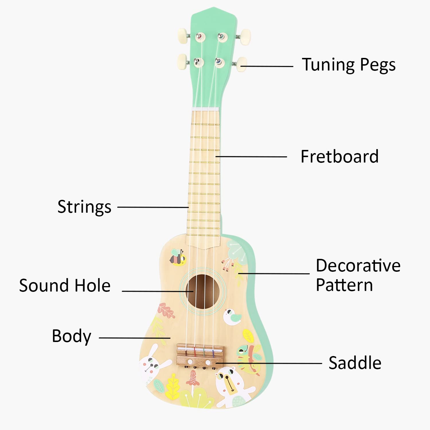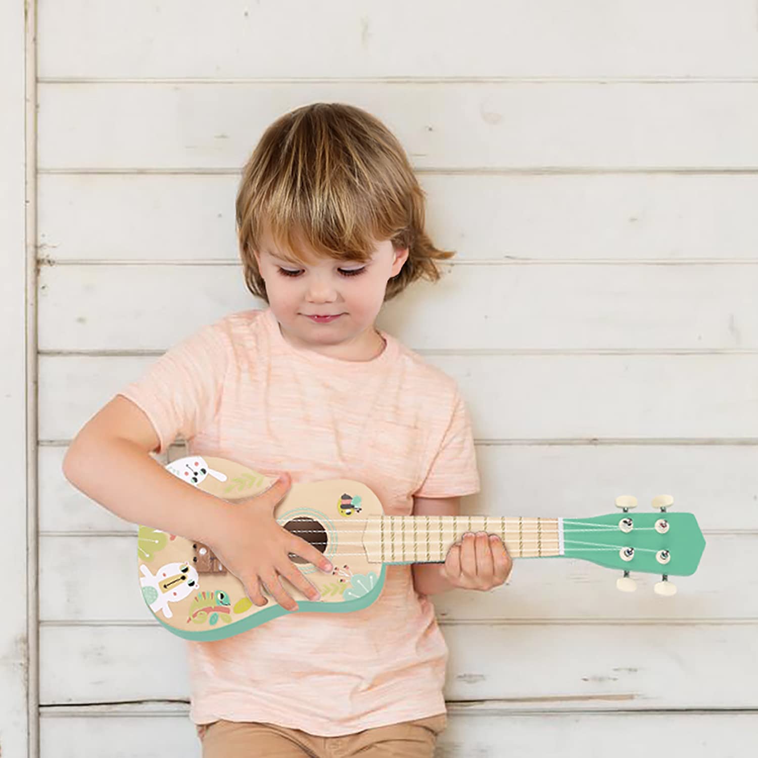 TOOKYLAND 4-string wooden ukulele is the perfect way to stimulate the artistic side of your child's brain and introduce them to the concept of music. When exposed to instruments, kids will explore the many ways of producing sounds and discover possible variations in timbre, pitch, rhythm, and volume. This ukulele is shaped like a small guitar, fretted, tunable, and pre-strung. The colors and illustrations on the uke add to the fun and visual stimulation. Children gain many developmental benefits when playing music, such as building gross and fine motor skills and enhancing hand-eye coordination. Music also has many cognitive benefits, such as sensory development, learning patience, perseverance, and better focus. The instrument is made of wood and painted with non-toxic, child-safe, water-based paint for a safe playing environment for your children. Suitable for ages three years and up. It measures 21 in long and 6.7 in wide