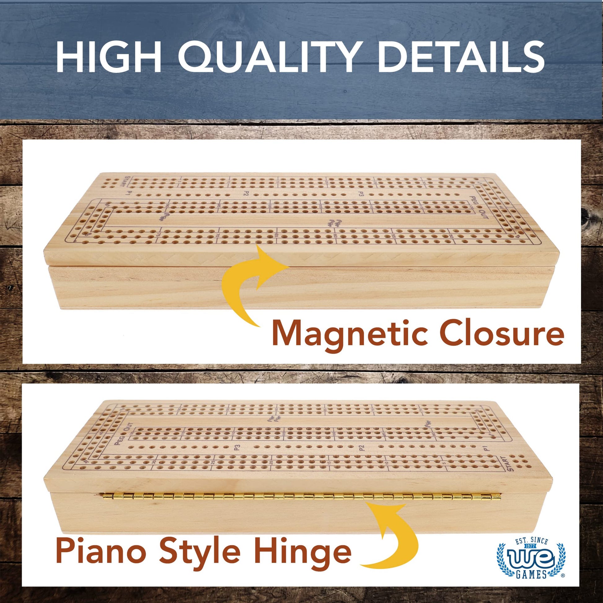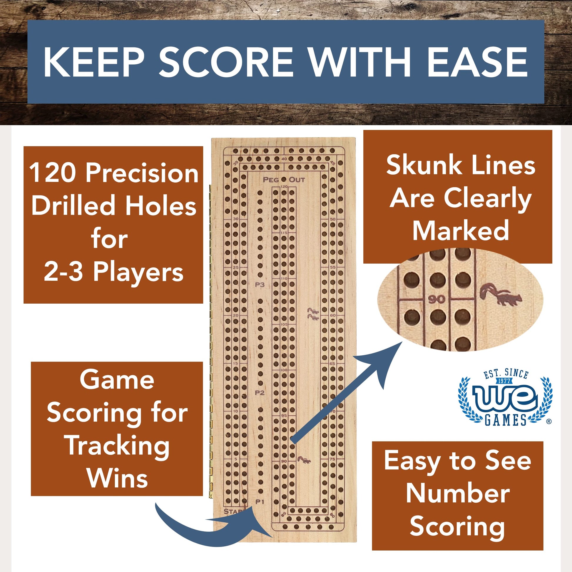 Available In Several Variations: Visit Our Brand Store For Different Colors, Versions, And Other Variations Of This Classic Family Board Game. We Sell Pegs Too! | Wooden Cribbage Board Game Set: Craft Construction Makes This Classic 3-Player Cribbage Set An Absolute Favorite. Made Of Two Solid Pieces Of Hardwood And Connected With A Piano Style Hinge For Added Strength. A Magnetic Closure Holds The Board Closed And Allows For Travel. | Unique 3 Track Board For Scorekeeping: The 3-Track Continuous Board Features Precision Drilled Peg Holes And Laser Engraved Scoring. Includes 3 Peg Starting Area, 120 Count Full-Sized Cribbage Game Board, Skunk Lines, And A Peg Out Finish Hole. | Storage Area For Cards & Pegs: Our Cribbage Board Measures 10 X 3.5 X 1.5 In. Storage Grooves Inside The Board Store A Deck Of Cards And 9 Metal Cribbage Pegs (3 Chrome, 3 Brass, 3 Black). Instructions Included. | Fun For Everyone: Cribbage Is Known For The Cribbage Board, Or Crib, Which Is Used For Scorekeeping. The Crib Contains A Series Of Holes On Which The Score Is Tallied By Pegs. Points Are Registered By Pegging The Score Along The Cribbage Board. | Follow Our Brand Store: For More Wooden Board Games, Dice Games, Card Games, And More. Visit Our Brand Store To See Everything We Games Has To Offer.