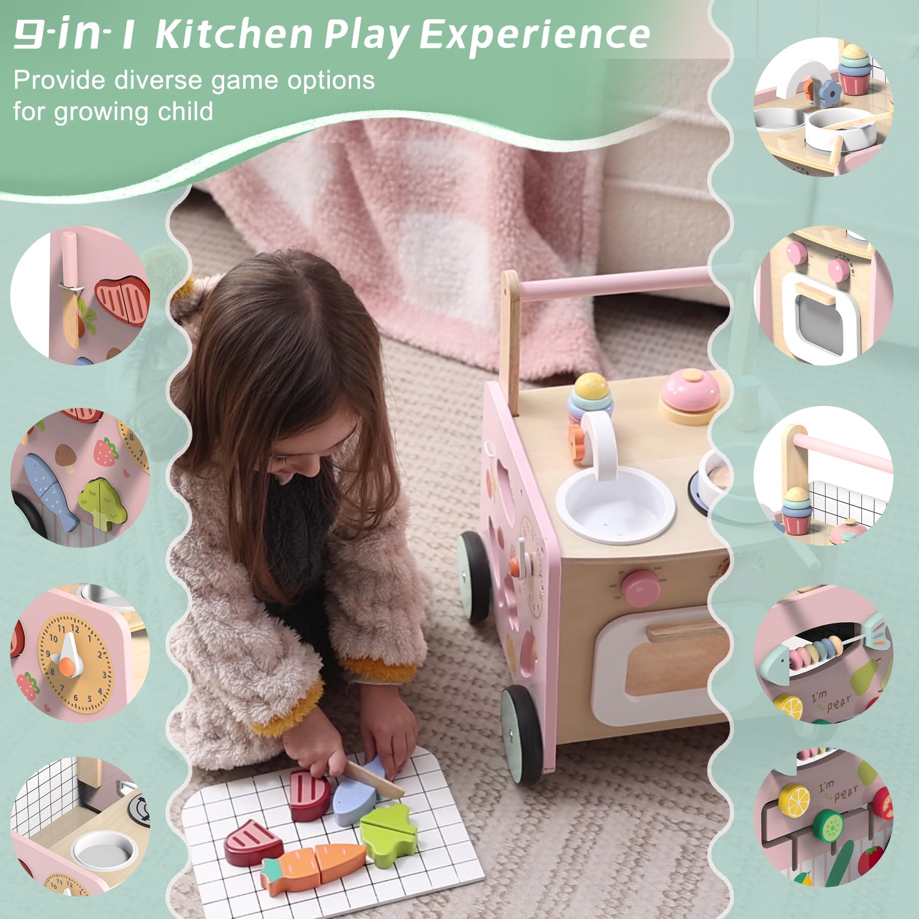 Wiqins Wooden Baby Walker 9-In-1 Activity Center With Toddlers Montessori Sensory Toys And Play Kitchen Push Walker For Kids Wit