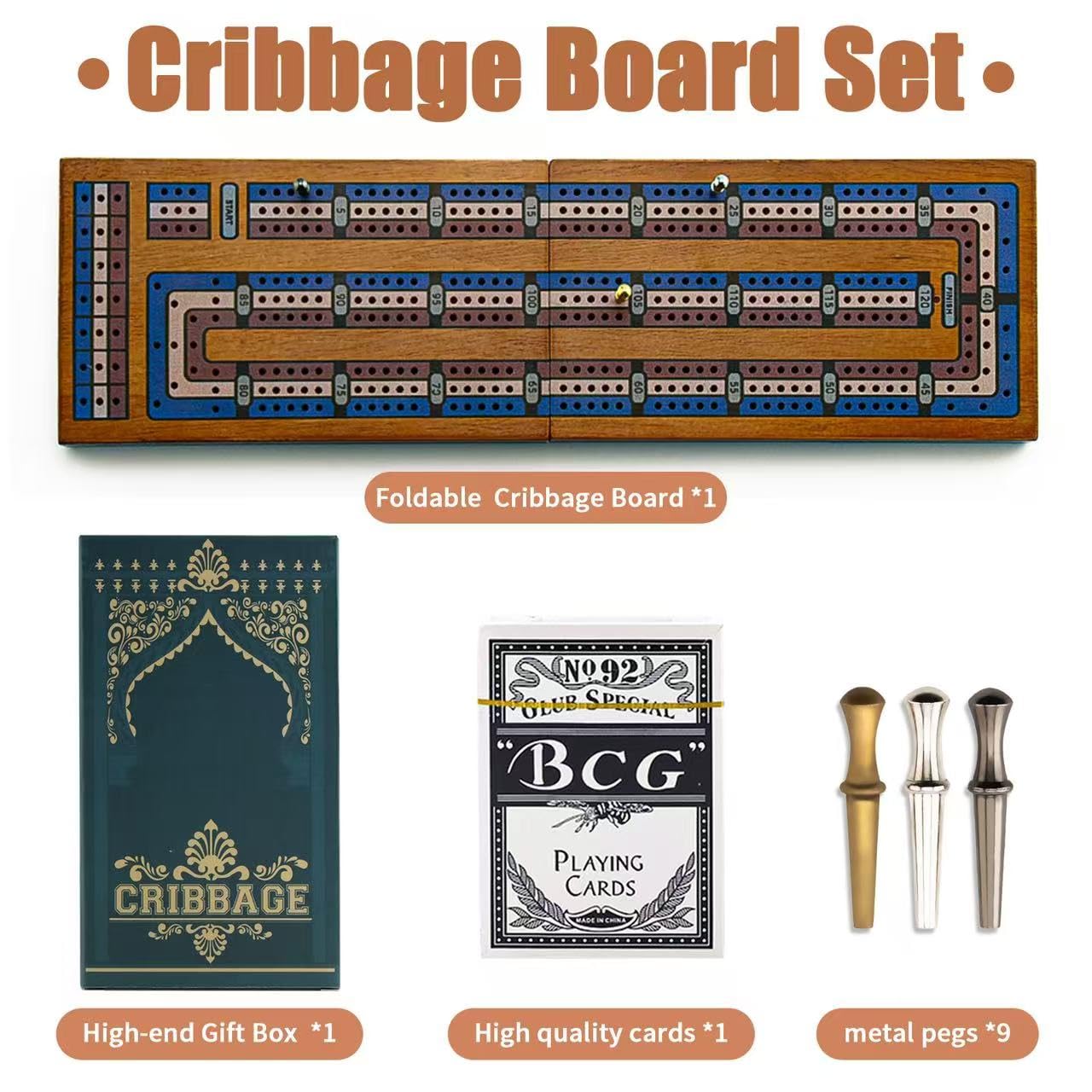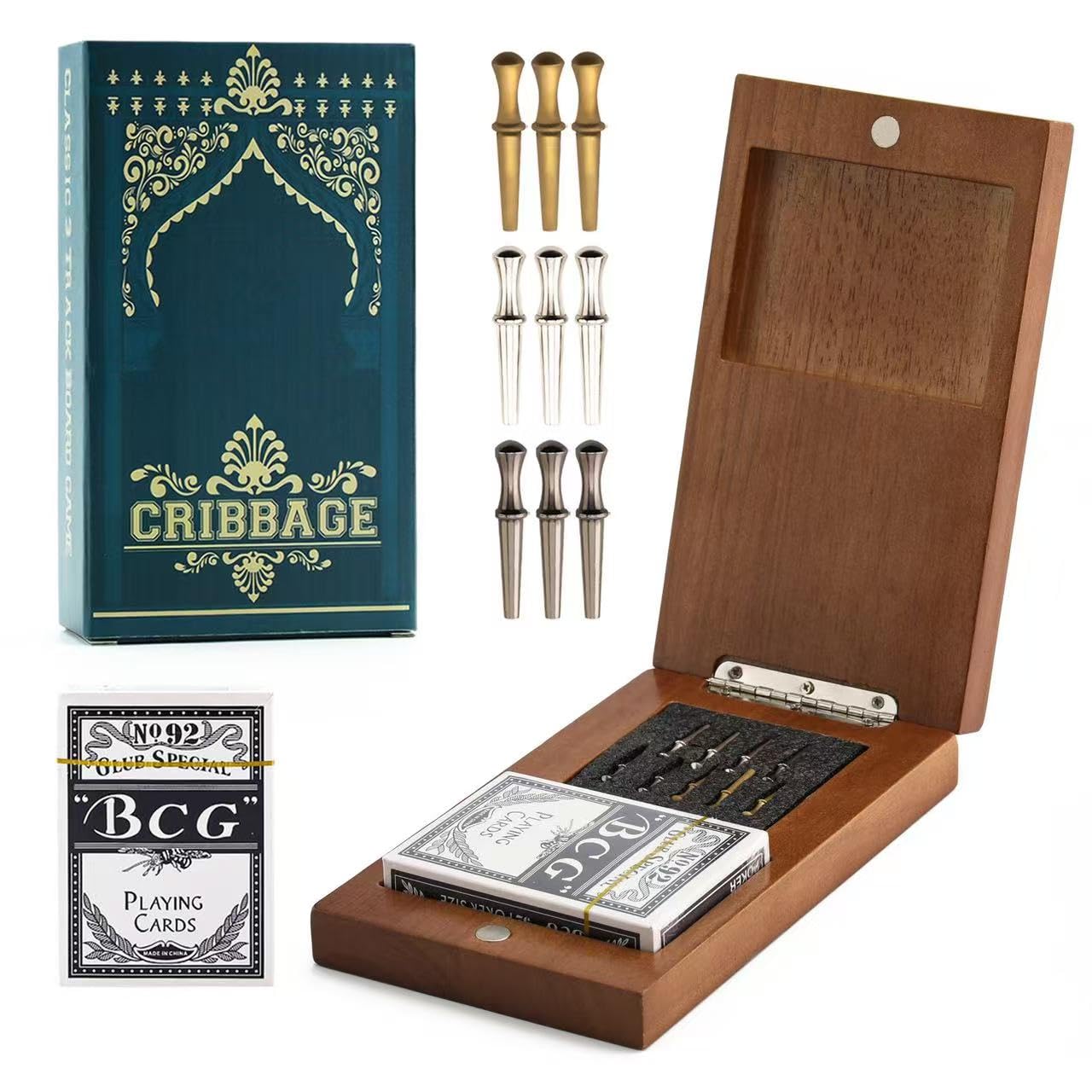 Wooden Cribbage Board Game Set, Travel Cribbage Board With Storage And Collapsible, With Magnetic Lock / 9 Metal Pegs/Full Deck