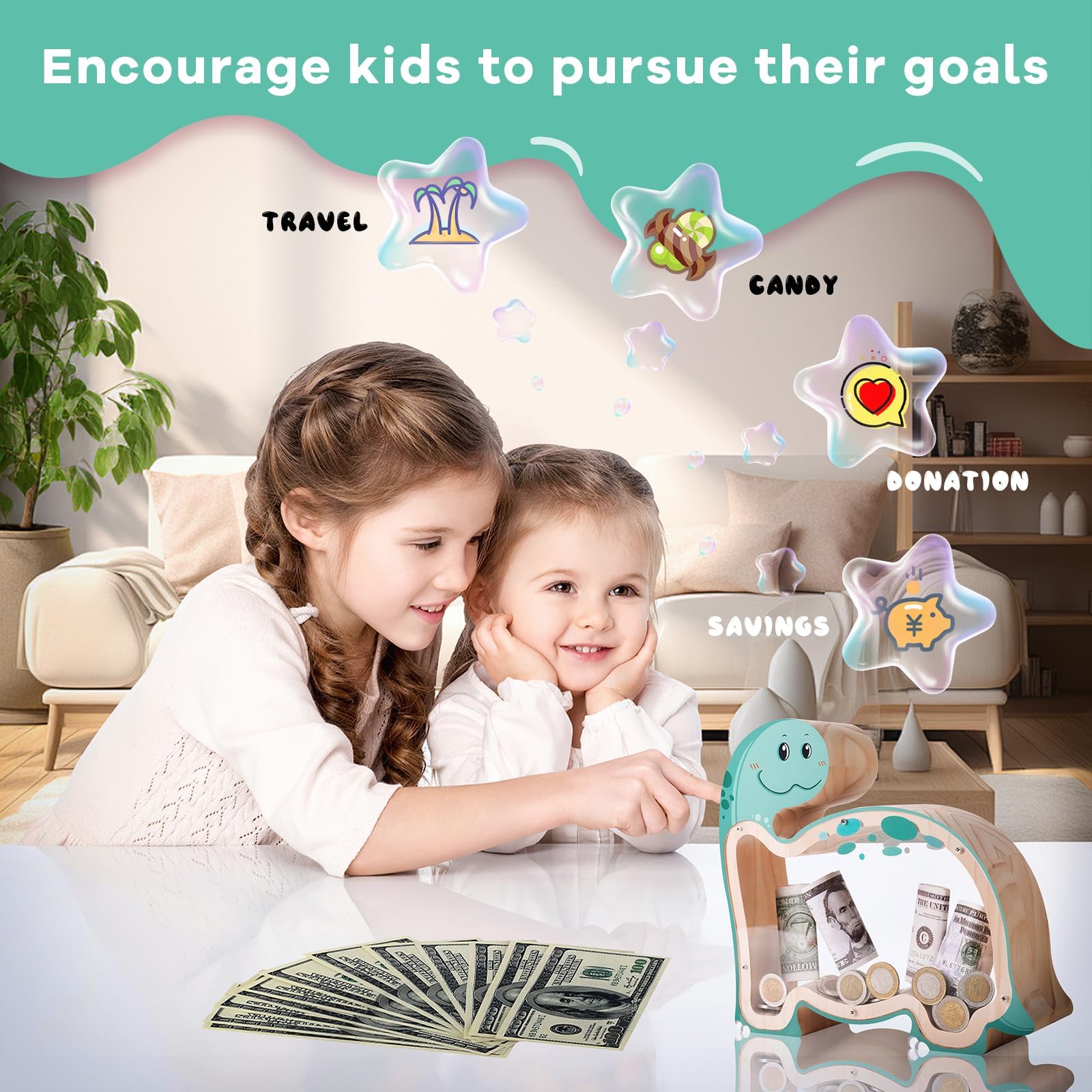 Natural Piggy Bank for Kids - The piggy bank features a cute piggy image, made of natural wood, with oversized capacity. The overall shape of the piggy bank toy is naive, which makes kids fall in love with it at a glance. The color scheme is warm and childlike. You can view the storage through the transparent acrylic window to help your child develop the habit of saving money and explore the fun of saving money. The large piggy bank is the perfect gift for children.