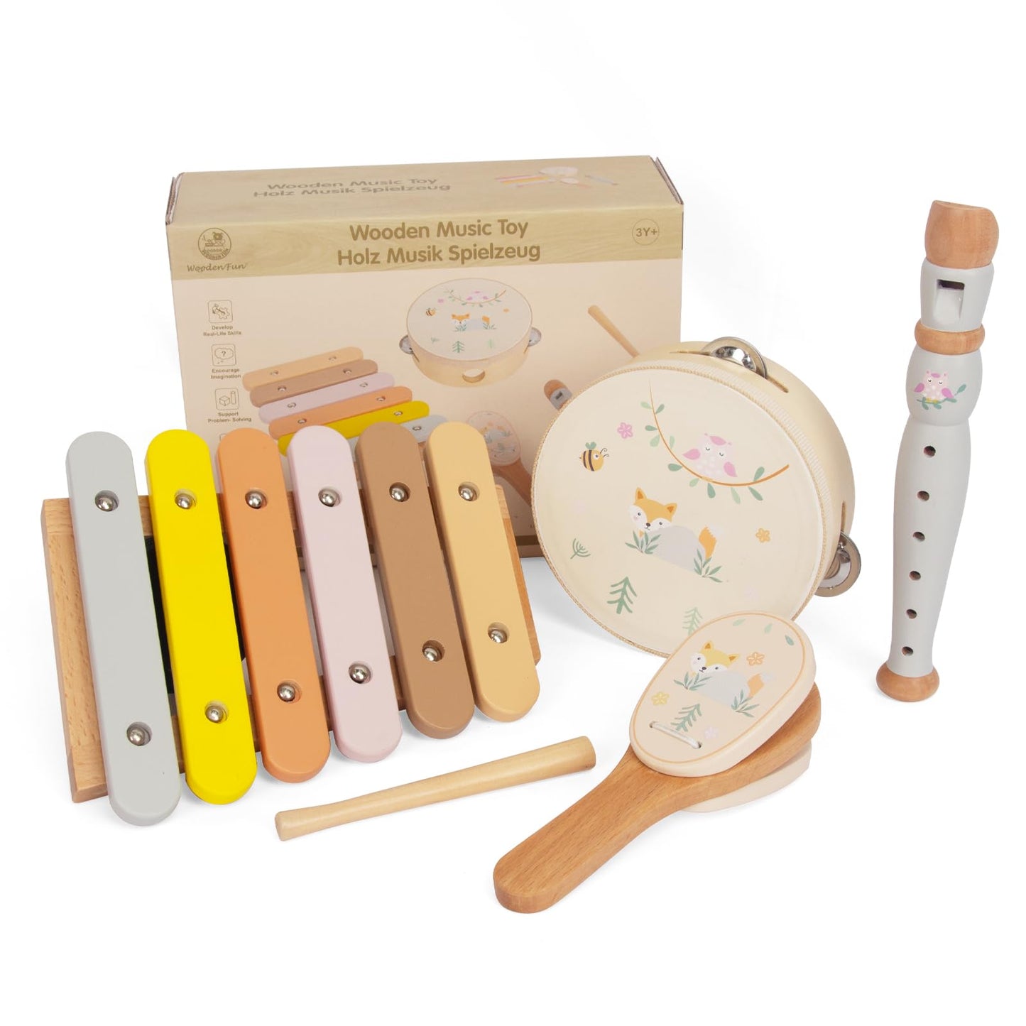 WOODENFUN Musical Instruments Set for Toddlers 3, Wooden Educational Music Toys Percussion Kit Not only toys, but also real musical Instruments for toddlers' music enlightenment. Shaking, tapping, beating and blowing instruments, this musical instruments set is a perfect educational musical toys to get kids moving, grooving, and feeling the beat. Fit for both boys and girls. Great Christmas, birthday gift for preschool kids and children. Educational Early Learning Musical Toys This toddler instrument set would be a hot spot in kids party. Your kids and their little friends can enjoy an interesting corner with this set. They can create their musical world and share happiness. Enhance Parent-child Relationship This wonderful musical instrument set will bring hours of wonderful playtime to children. You can enjoy the parent-child time, know your child better through musical games. Develop Kids Multi Abilities The instruments toy set inspires childrens sense of sight, hearing and touch, discover their musical talents, developing your kid's musical sensitivity, creativity, hand and eye coordination. Montessori music toys are packaged with a box. Ideal birthday, awards, party, festivals, Thanksgiving, Christmas gifts for preschool kids boys and girls. Bring the kids endless hours of fun and happy childhood memory!