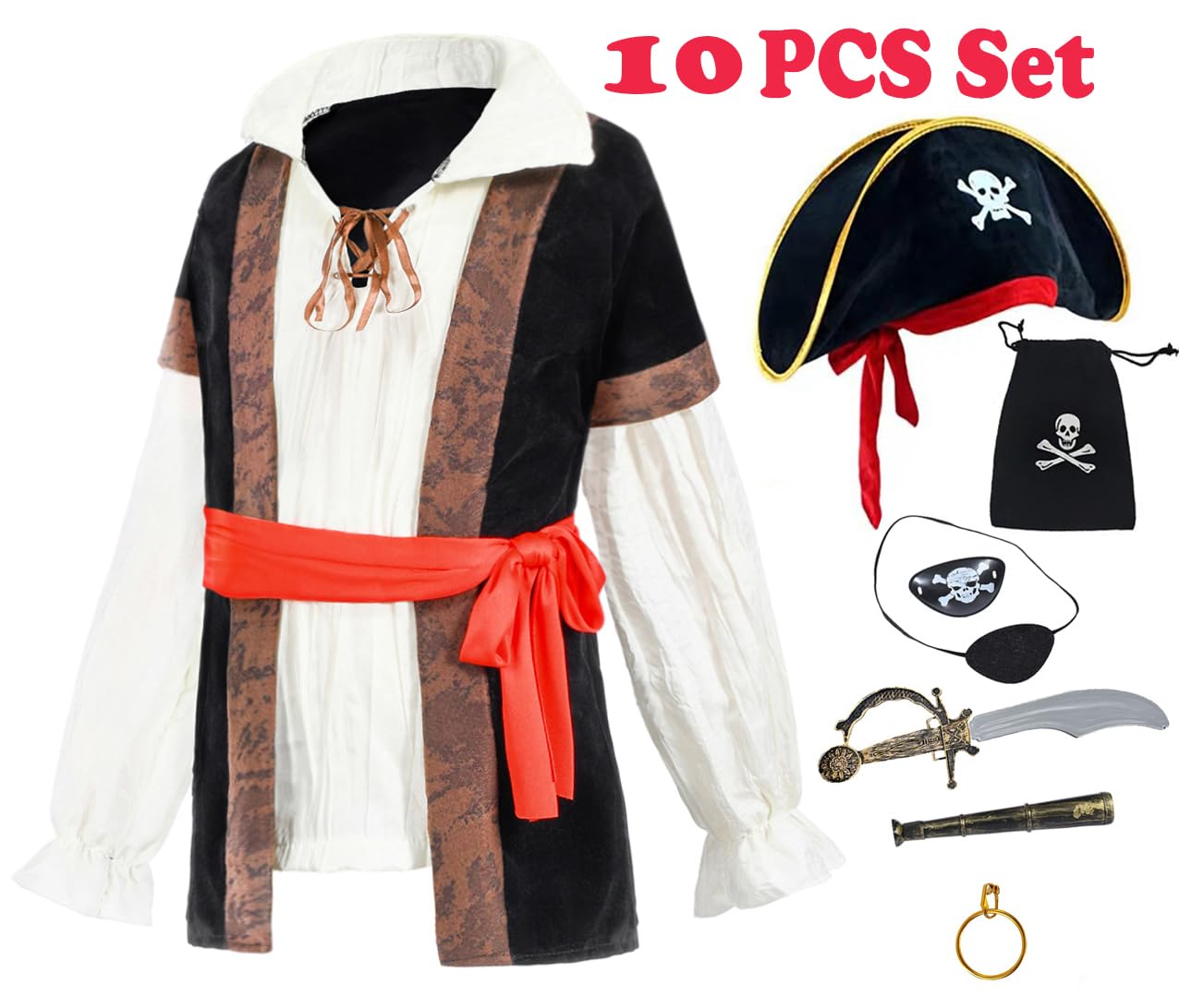 - Q: What items are included in the pirate costume set? A: The costume set includes a coat, pants, hat, belt, two eyepatches, a toy prop, telescope, earrings, and a bag, totaling 10 pieces for a complete pirate look.