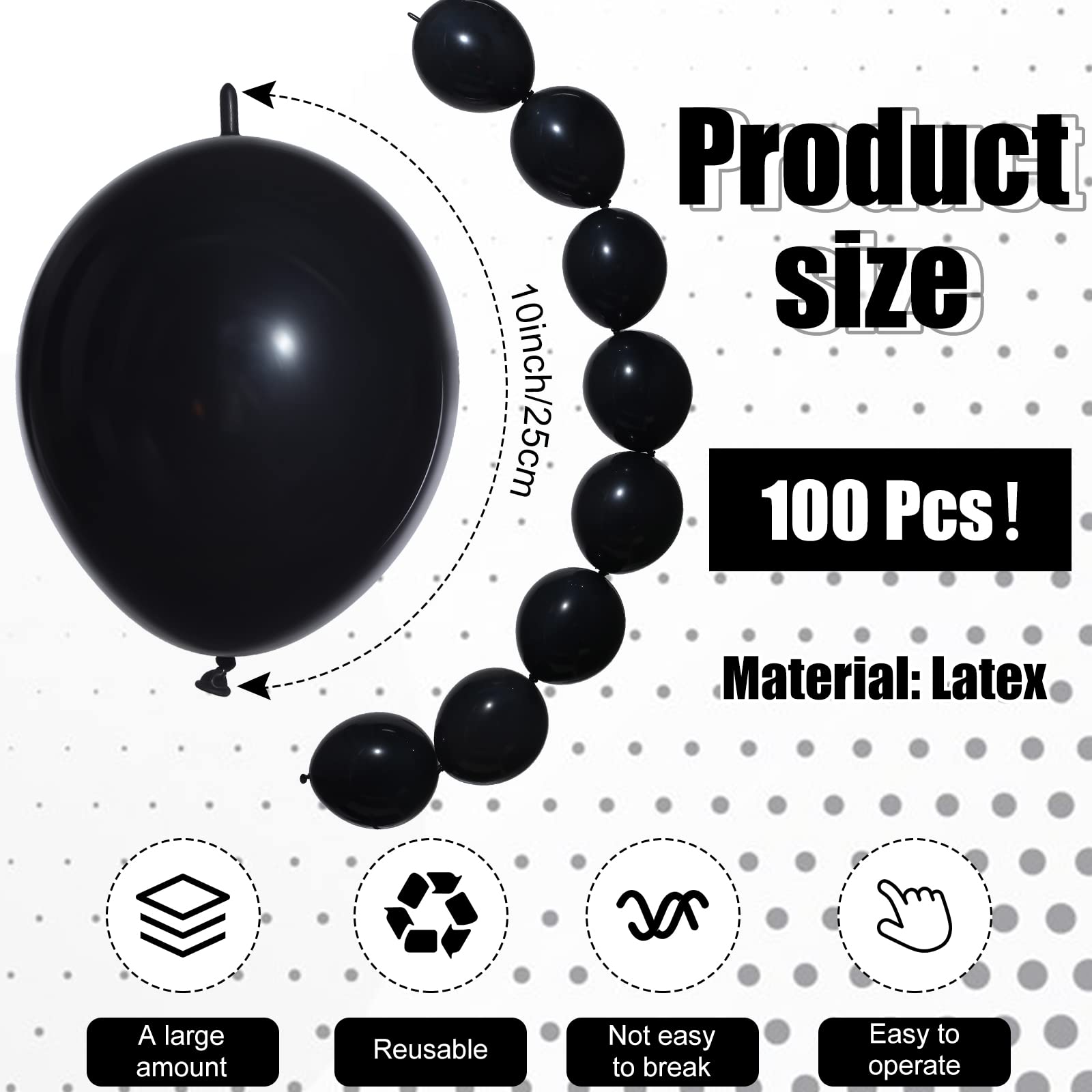 • Q: How many link balloons are included in a package? A: Each package contains 100 link balloons, each measuring 10 inches. This quantity is great for decorating large spaces or creating elaborate balloon displays for various celebrations.