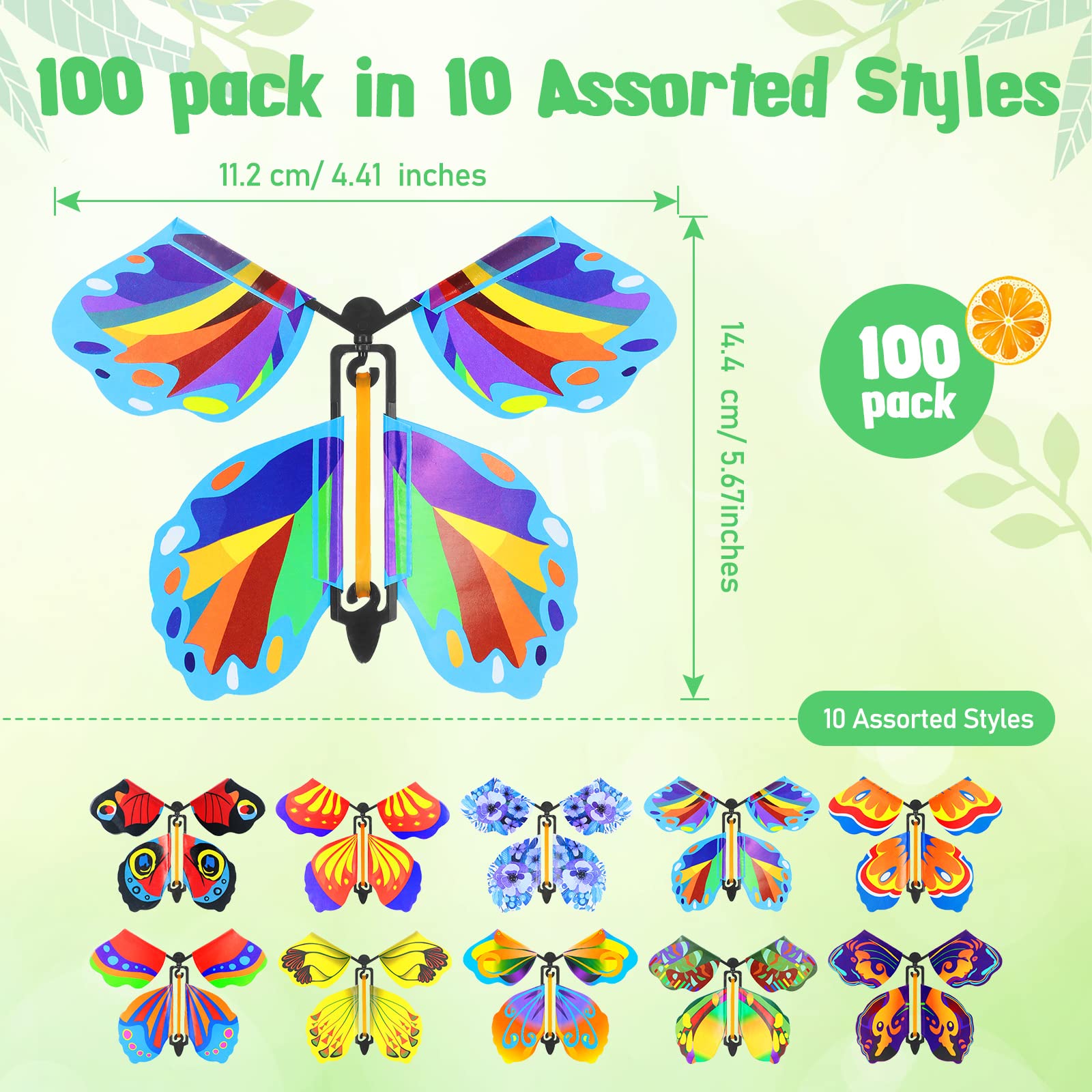 100 Pcs Magic Flying Butterfly Fairy Flying Colorful Wind Up Butterfly In The Book Rubber Band Powered Greeting Card Surprise Gift, 10 Styles