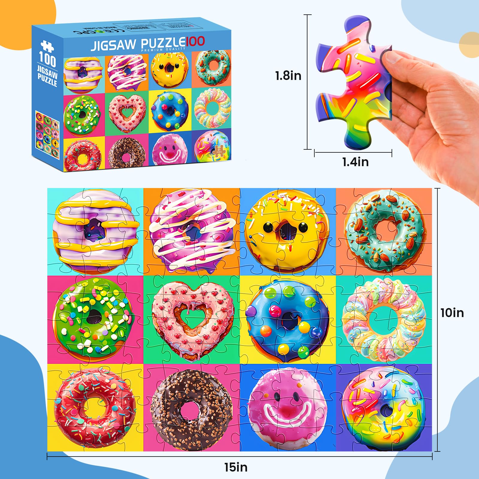 100 Pieces Puzzles For Kids Ages 4-8 | Delicious Donuts Jigsaw Puzzles | Large 100 Piece Puzzle For Toddler Children | Sturdy,Safe | Engaging & Educational Toys Great Gift For Boys Girls,15X10In