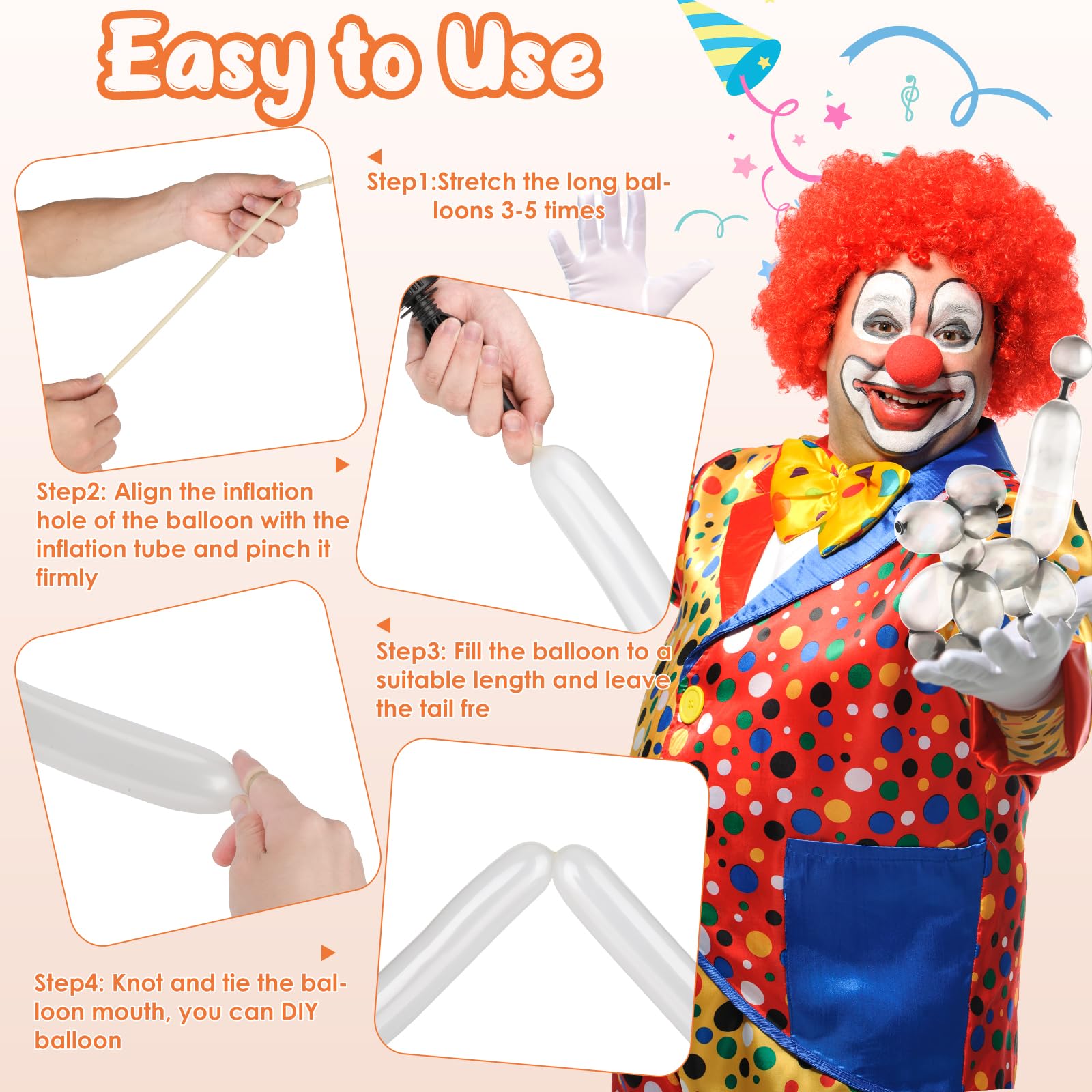 • Q: How do I inflate and use the 260 balloons? A: These balloons can be easily inflated using a balloon pump. After inflating, securely tie the end of the balloon and leave about 10 centimeters uninflated to allow for twisting and shaping into various models.