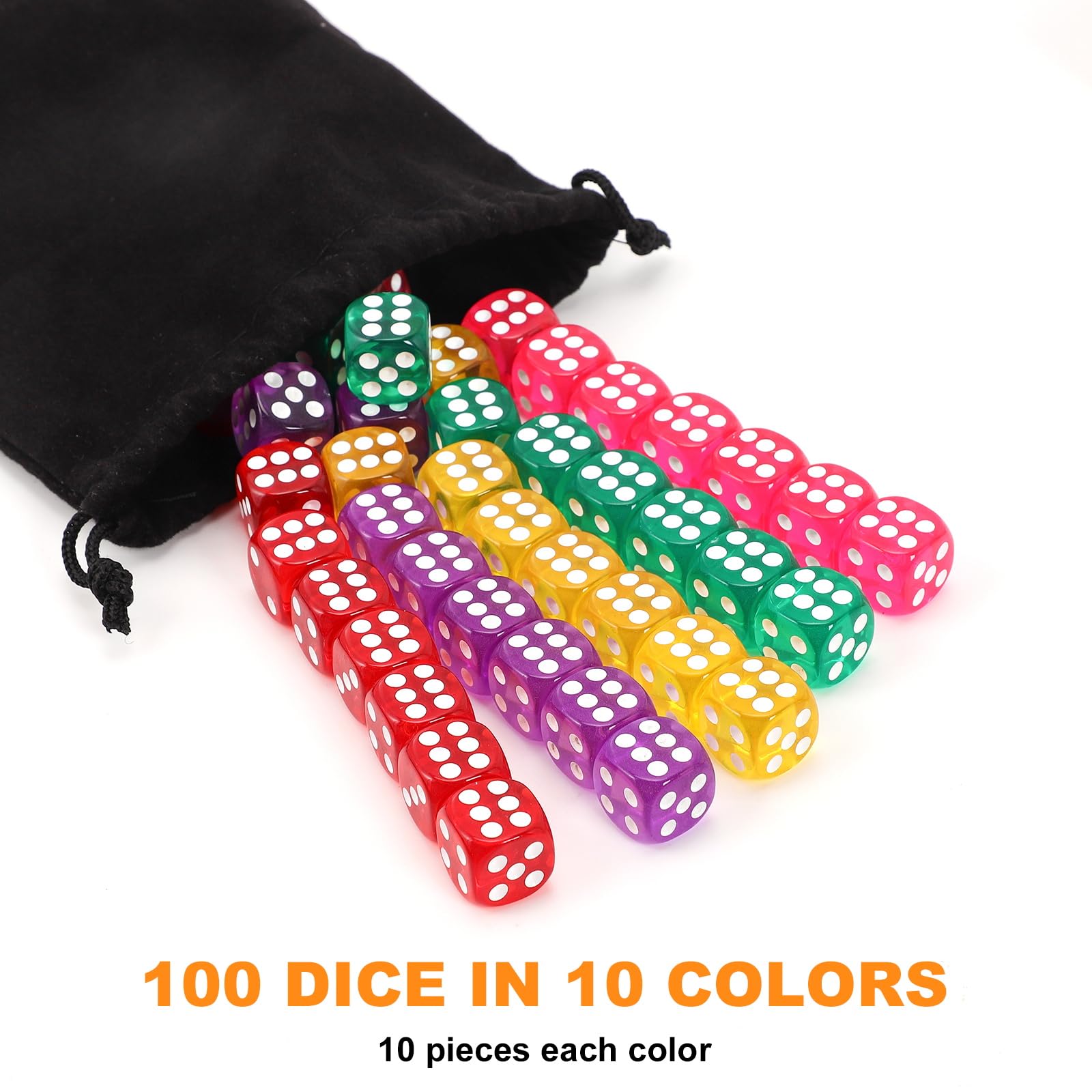 100Pcs Colored Dice Set Standard 16mm Game Dice Bulk with a Black Drawstring Storage Bag