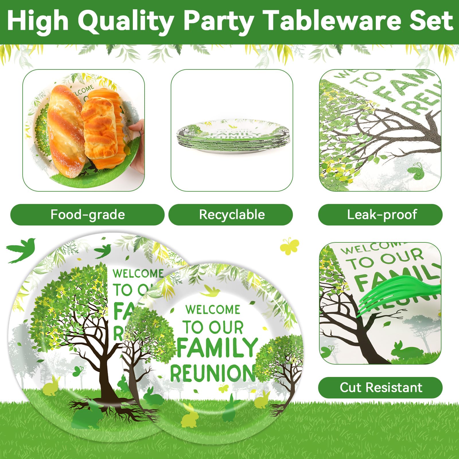 - Q: What items are included in the family reunion tableware set? A: The family reunion tableware set includes 24 pieces of 9-inch family reunion paper dinner plates, 24 pieces of 7-inch family tree reunion plates, 24 green tree napkins, and 24 plastic green forks, sufficient to serve up to 25 guests.
