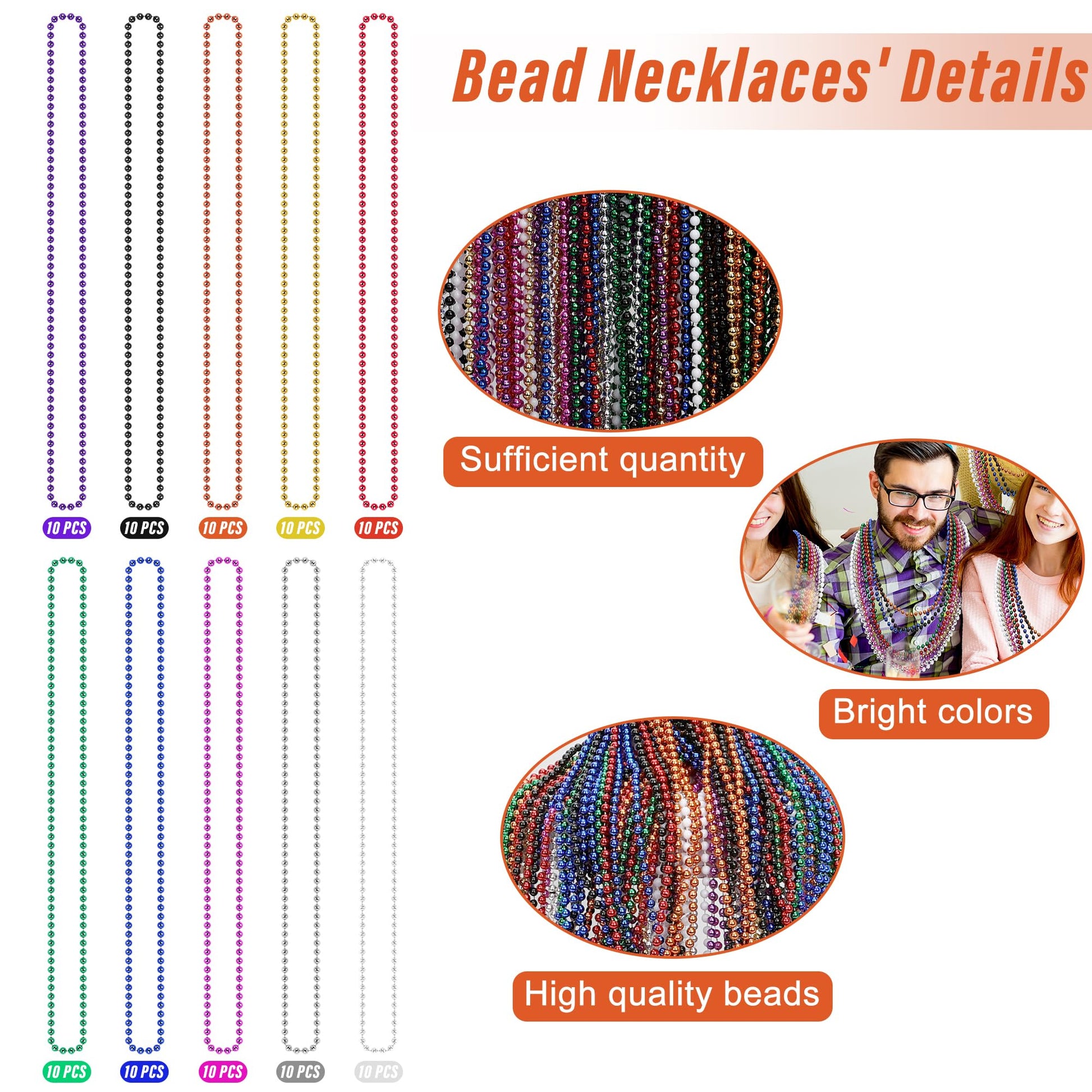 100PCS Mardi Gras Beads, 10 Kinds of Color Bead Necklace Toy Party Favors, 33'' Bead Costume Bulk, Festival Parade Throw Accesso