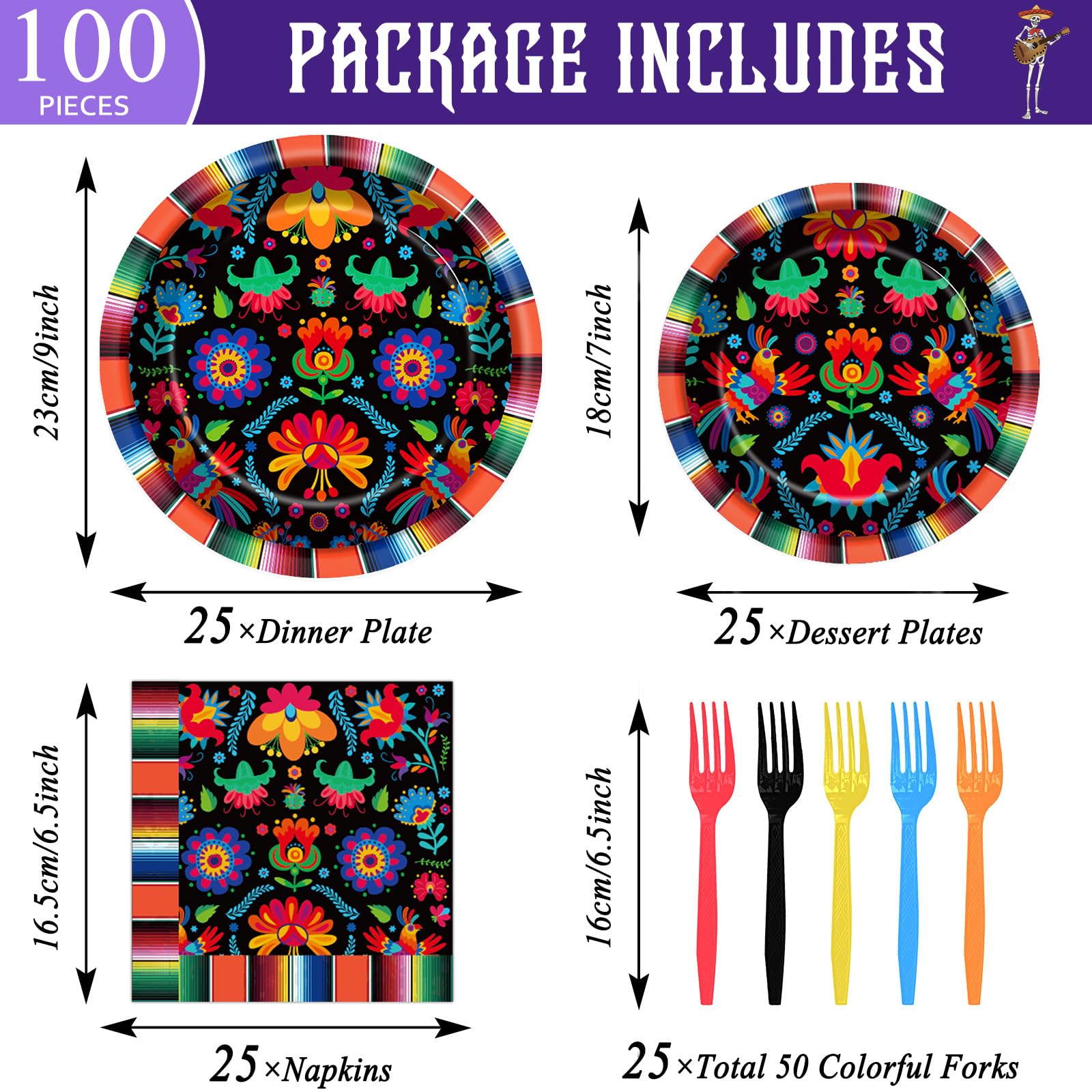 - Q: What is included in the 100PCS Mexican Fiesta Party Plates and Napkins set? A: The set includes 25 dinner plates (9 inches), 25 dessert plates (7 inches), 25 lunch napkins (6.5 inches when folded), and 25 forks, making it perfect for serving up to 25 guests.