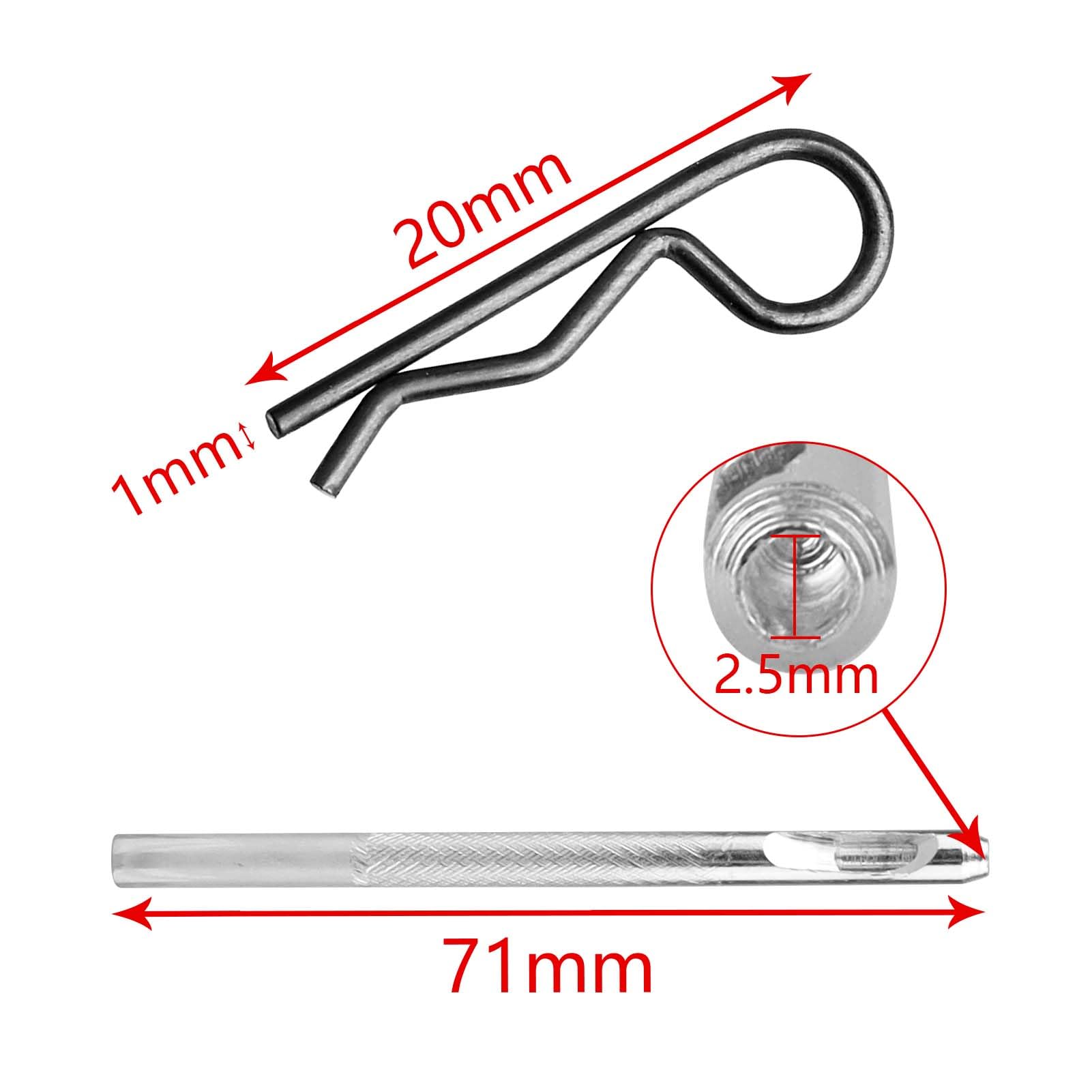 - Q: What is the rod diameter and total length of these body clips? A: The rod diameter of the AllinRC body clips is approximately 1mm (0.039 inches) and the total length is 20mm (0.79 inches), making them suitable for a variety of RC applications.