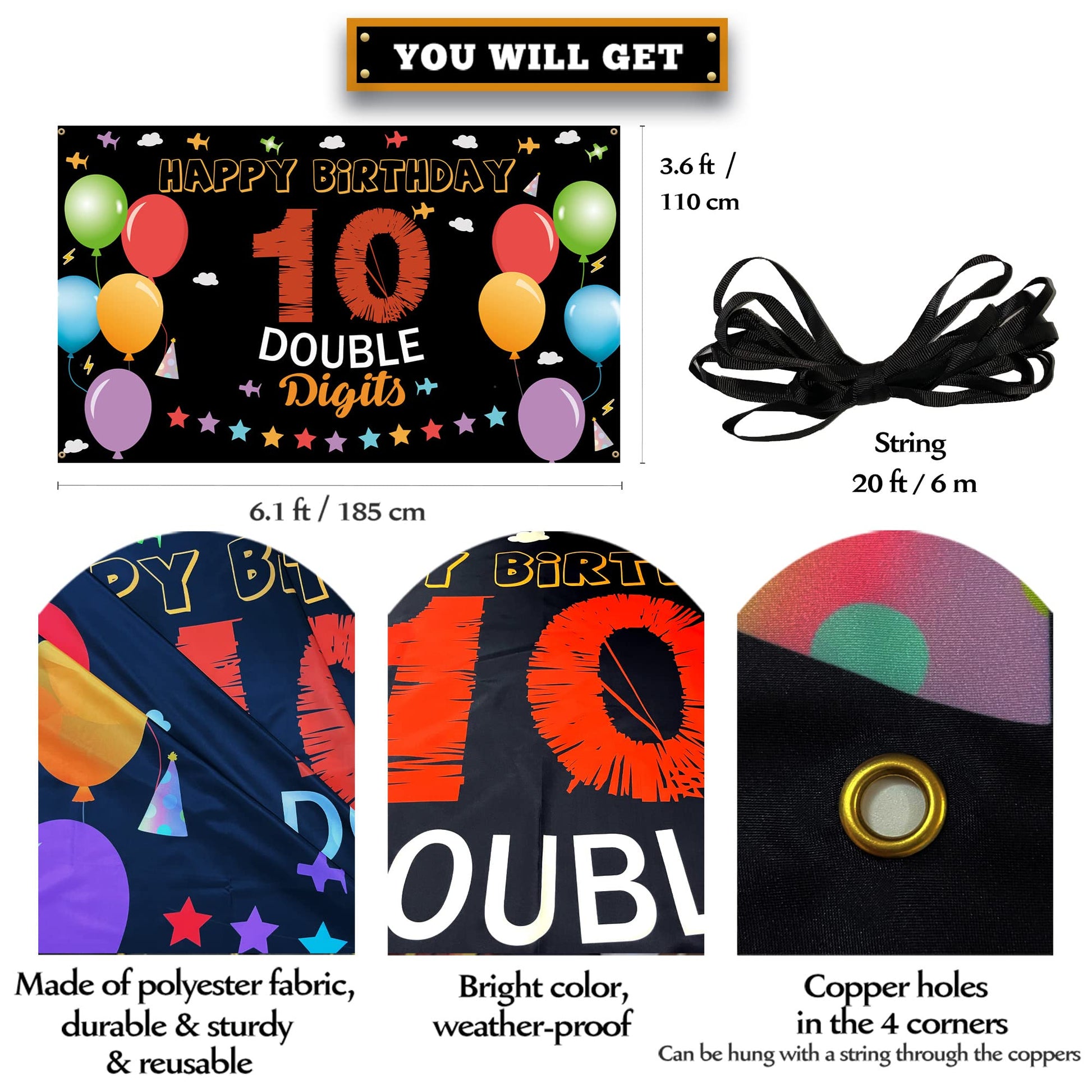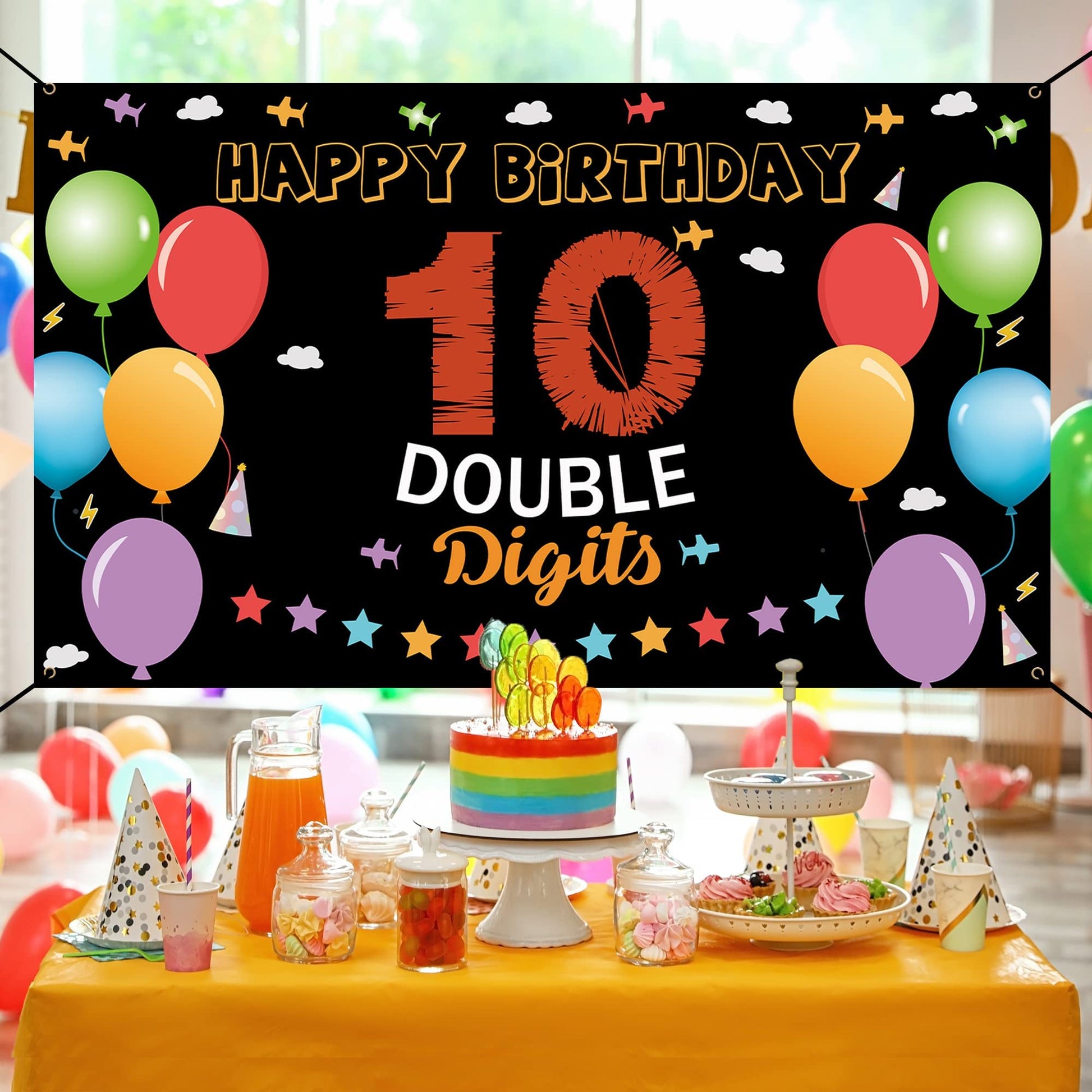 10Th Birthday Backdrop Banner, Happy 10Th Birthday Decorations, Kids 10 Year Old Double Digits Birthday Party Yard Sign Decor, C