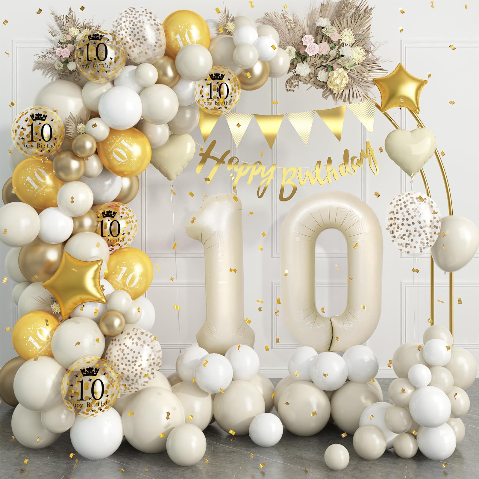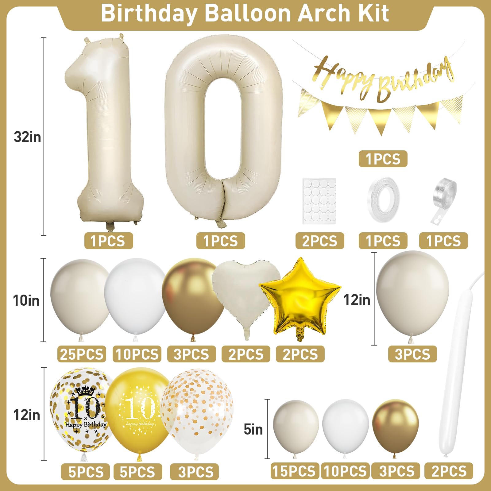 • Q: What is included in the 10th Birthday Balloon Arch Garland Kit? A: The kit includes 32-inch '10' foil balloons, a 'happy birthday' banner, a triangle flag, 43 sand white balloons (various sizes), 20 white balloons, 10 printed balloons, 6 metallic gold balloons, 4 foil balloons (star and heart-shaped), 3 gold dot balloons, 2 long balloons, and accessories like glue, balloon strips, and ribbon for easy assembly.
