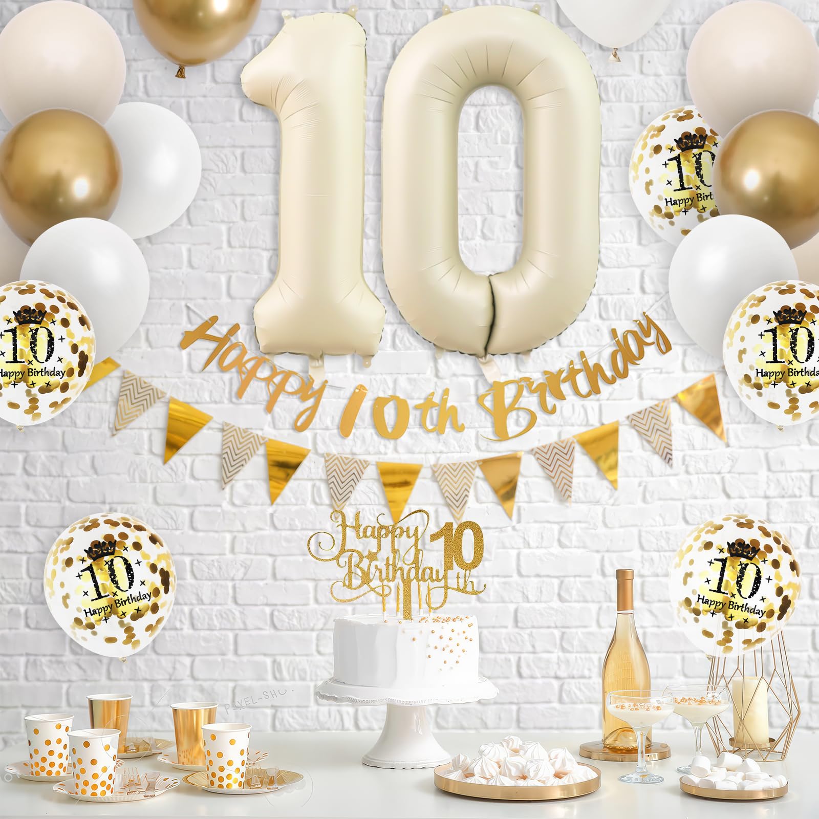 - Q: What items are included in the 10th birthday decorations set? A: The set includes a gold happy 10th birthday banner, gold triangle flag banner, number 10 foil balloon, happy 10th cake topper, 6 sand white balloons, 6 gold metallic balloons, 6 white balloons, 6 gold confetti balloons, and ribbons.