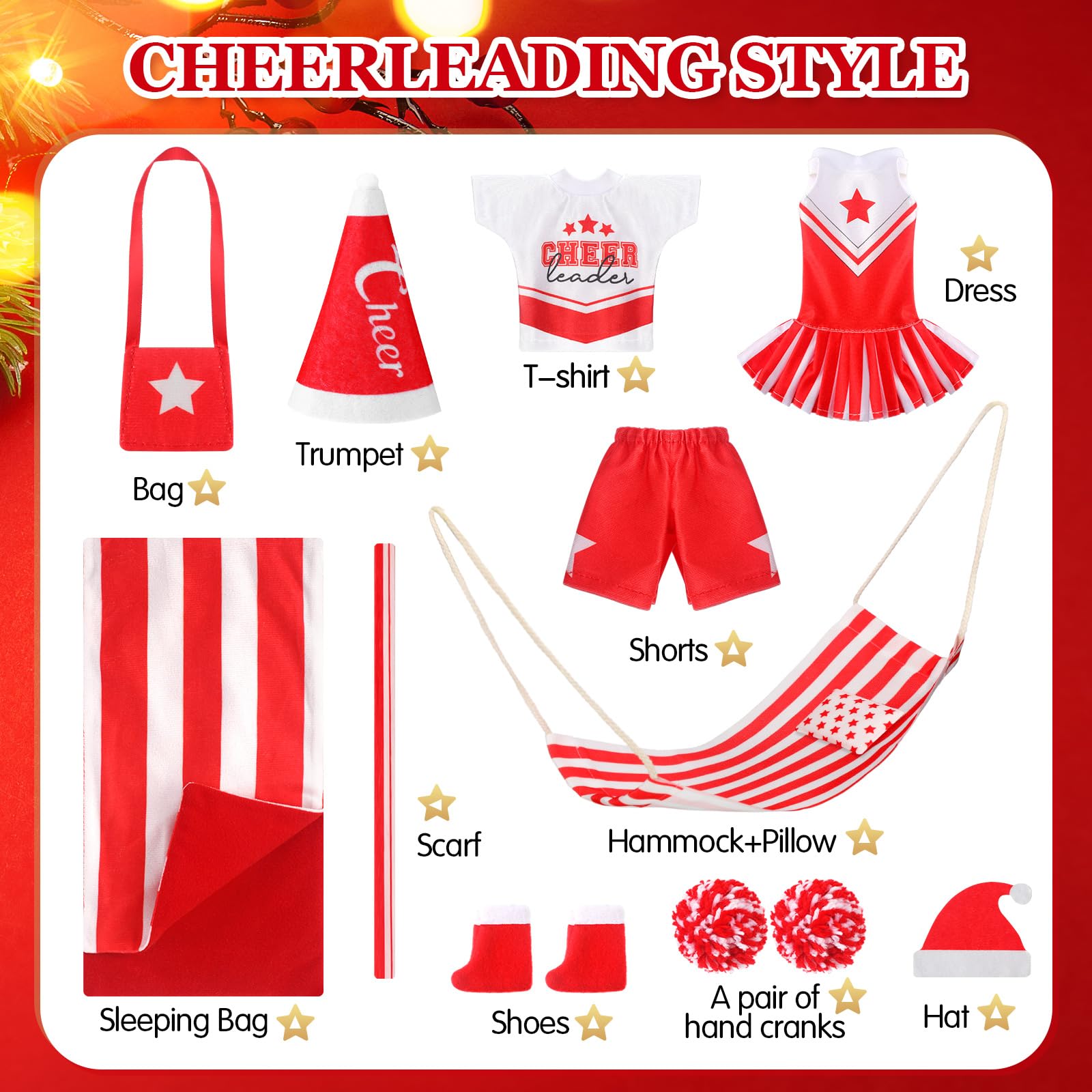 11 Pcs Christmas Elf Accessories Include Cheerleader Elf Doll Sleeping Bag Hammock Apron Chef Hat Dress Scarf Top Shorts Horn Po