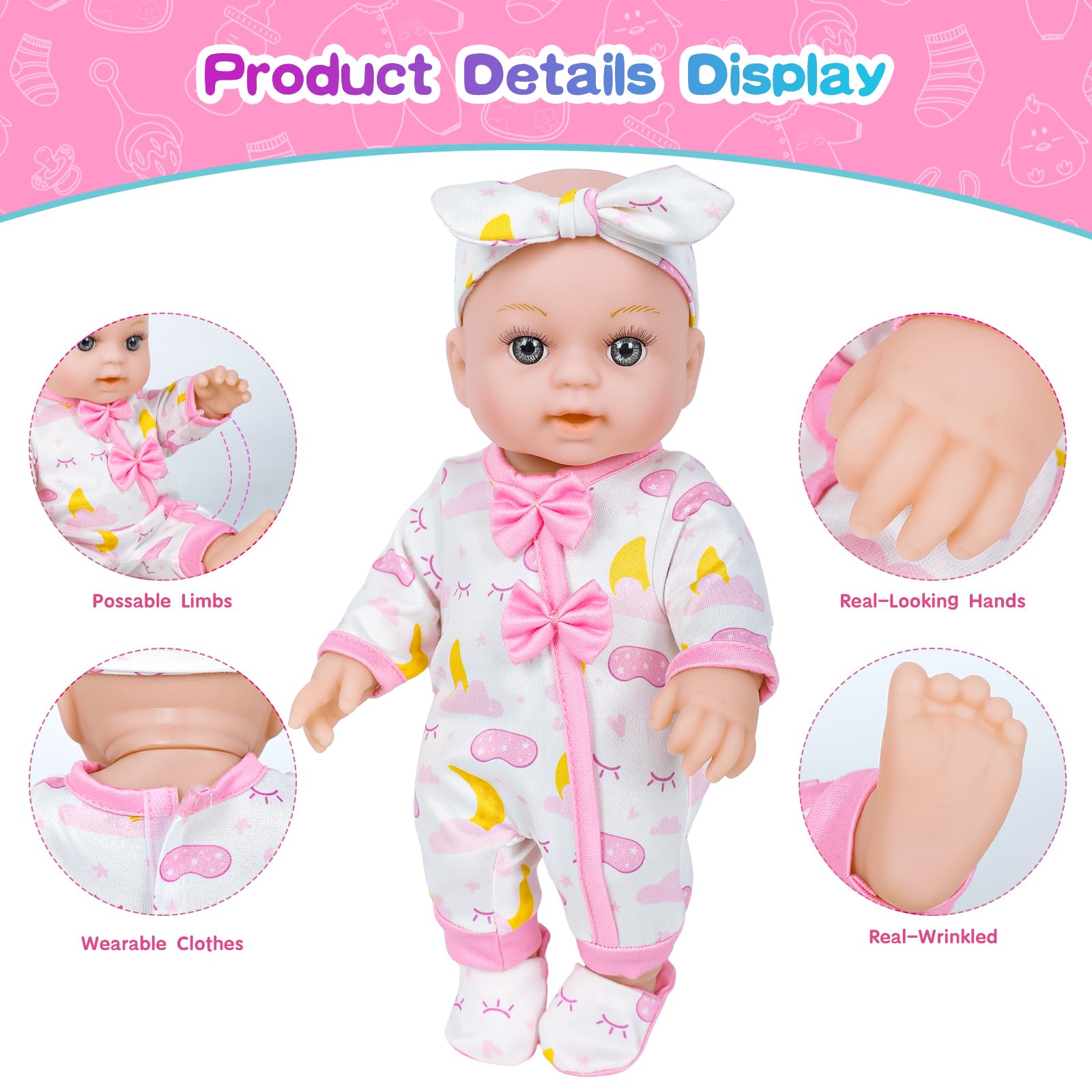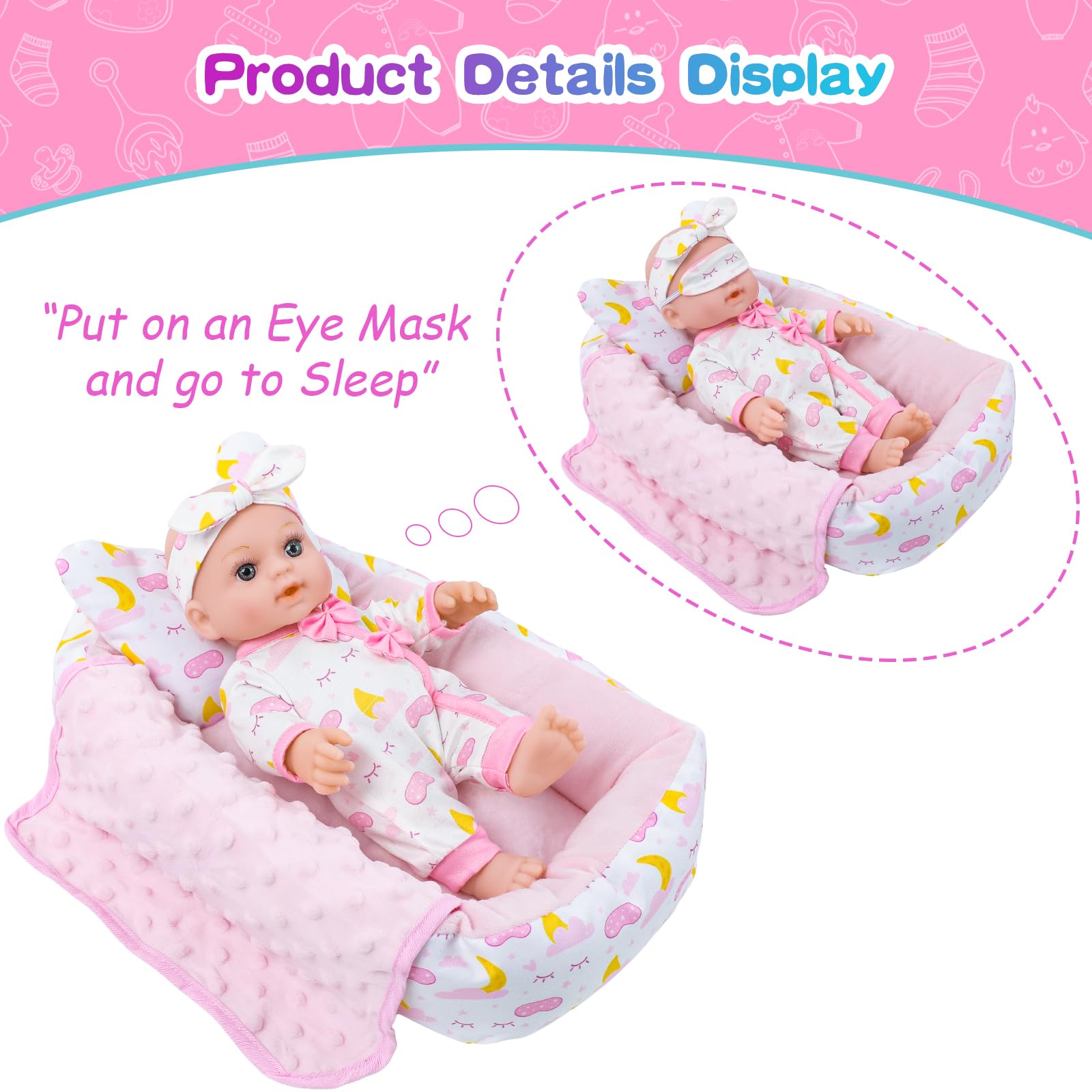 12 Inch Baby Doll Crib Playset with Dolls Clothes and Accessories Including Soft Sleep Bassinet Bed Bottles Nipple Eye Mask Slippers Blanket Pillow Gift Idea for Ages 3+