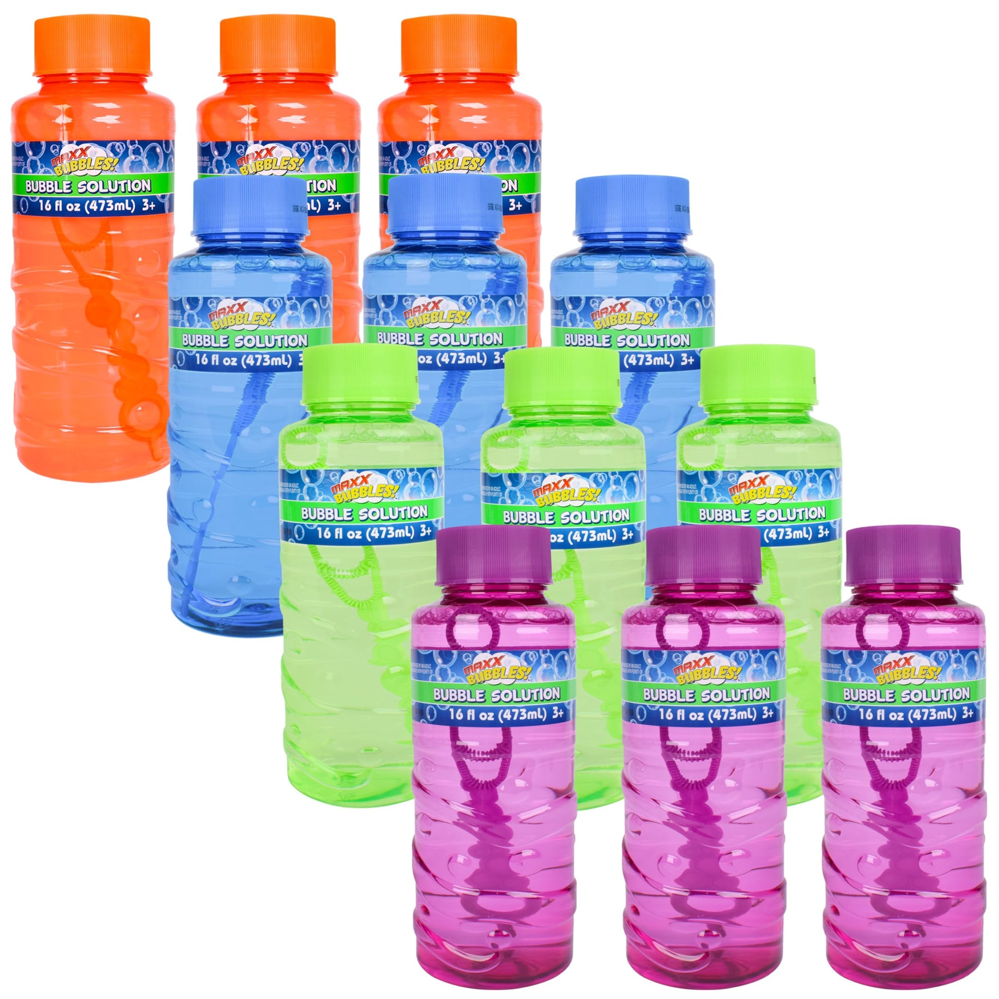 Create tons of bubbles with the Maxx Bubbles our 12 Pack of 16oz Bubble Solution. There are four different colored bottles of bubble solution, perfect for creating ultra fun bubbles anytime and anywhere. Ready to use for birthday parties, holidays, family events and every day fun! Kids and adults of all ages will have a blast blowing bubbles, chasing them and racing to pop each one. The easy grip bottle design and small size are great for carrying along with you. Non-toxic bubble solution helps to create longer lasting bubbles for more outdoor entertainment. Includes a specially designed wand for extra bubble blowing fun!