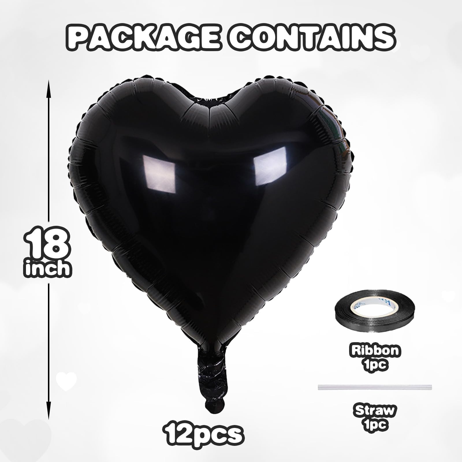 Add a touch of love and elegance to your special occasions with our Heart Balloons. This set includes 12 stunning 18-inch heart-shaped balloons in beautiful black colors. Whether youre celebrating a wedding, baby shower, anniversary, or Valentines Day, these balloons are sure to make your event unforgettable.Crafted from advanced material foil material, our Heart Balloons are resistant and long-lasting. Their superior sealing ensures that they stay inflated throughout your event, providing a charming backdrop for your celebrations.Easy to inflate with helium, these balloons can be effortlessly filled using a balloon pump or helium tank. Once inflated, they will float gracefully, adding a whimsical touch to your decorations.These balloons can be reusable, making them a sustainable choice for your parties. Simply deflate them after use and store them away for your next celebration.Transform any space into a romantic paradise with our Heart Balloons. Whether used as standalone decorations or as part of a larger balloon arrangement, they are sure to impress you and create cherished memories!