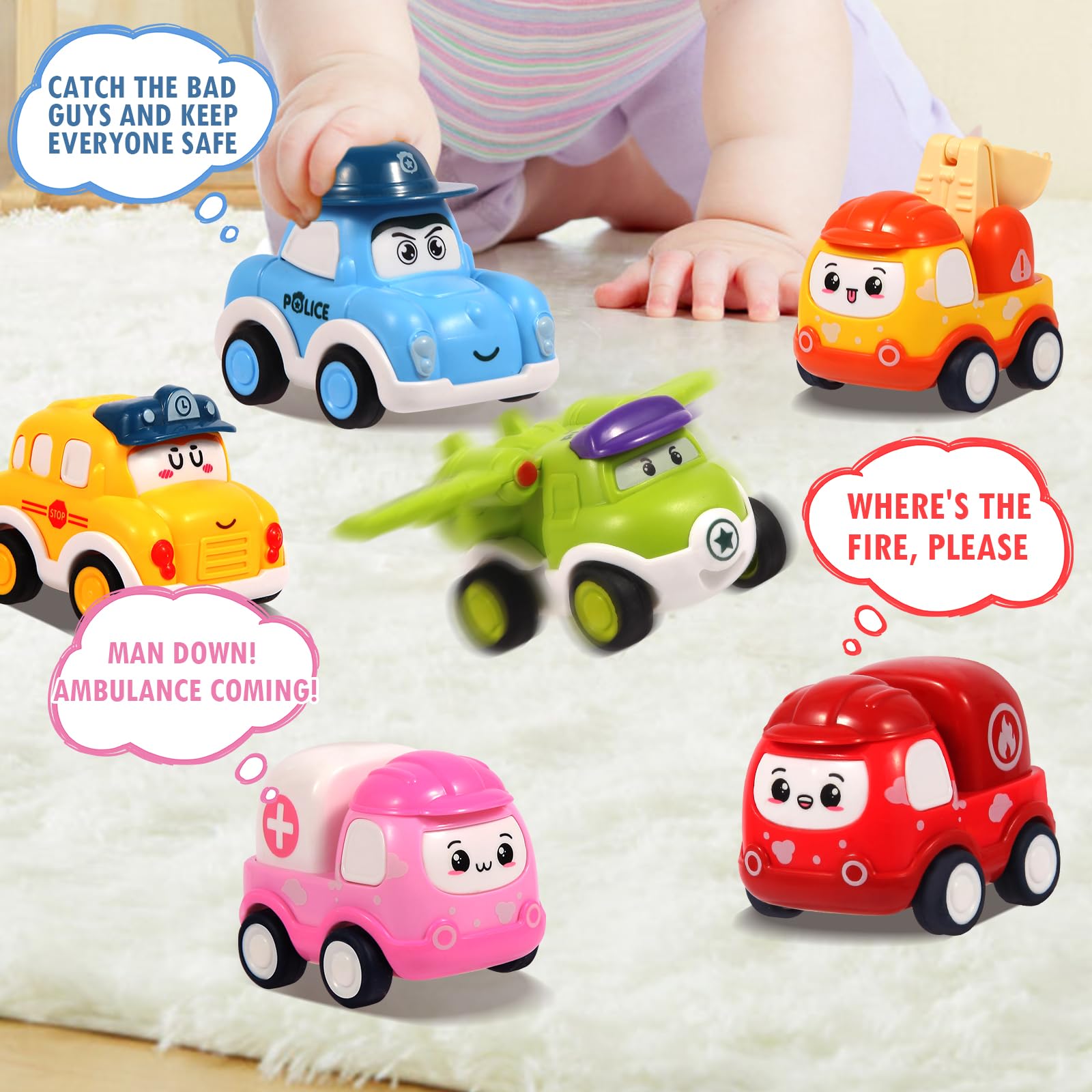 • Q: How can these toy cars help with a child's development? A: These toy cars encourage physical activity by enabling babies to roll over and crawl after them, promoting balance and coordination. The bright colors and cute designs also stimulate sensory and cognitive development, making them excellent educational toys.
