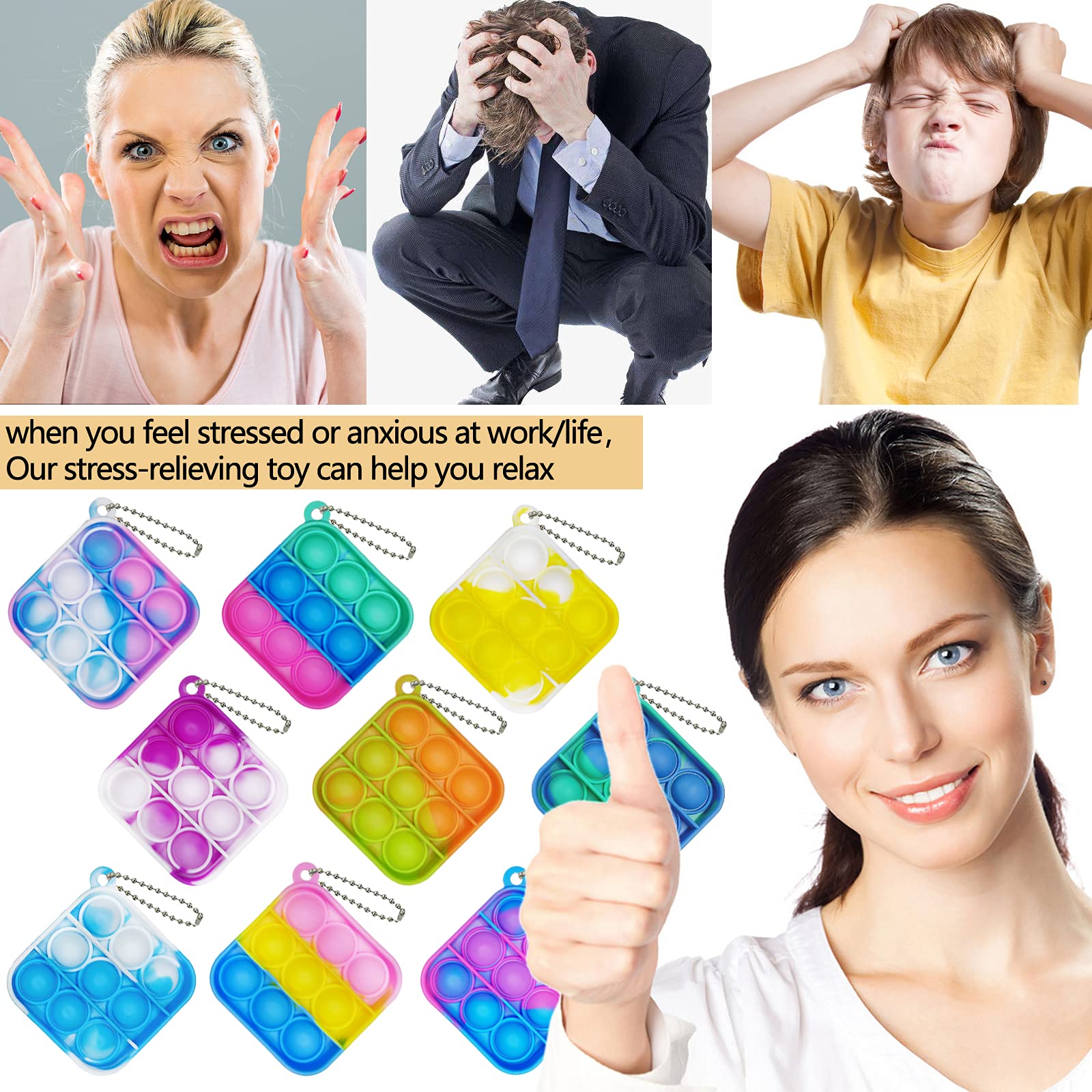 ?Package Include?:The Mini Bubble Set Includes 120 Mini Square Variety Of Colors, To Provide You With Different Needs. | ?Material?:The Mini Fidget Toy Is Made Of High Quality Silicone, Parents Can Rest Assured To Play With Their Children. | ?Easy To Clean?When The Toy Gets Dirty, Just Need A Little Water And Soap To Clean Restore The Toy To A Brand New Appearance. | ?Easy To Carry?:The Mini Fidget Toy Is Small Sized And Lightweight That You Can Take Them Anywhere. They Easy To Attach To Keys, Handbags, Rucksacks, School Bags And Belt Loops. | ?Functions?: The Mini Toy Will Be Loved By Children And Adults Of All Abilities. This Mini Fidget Toy Suitable For Kid And Adult To Relieving Anxiety And Stress.
