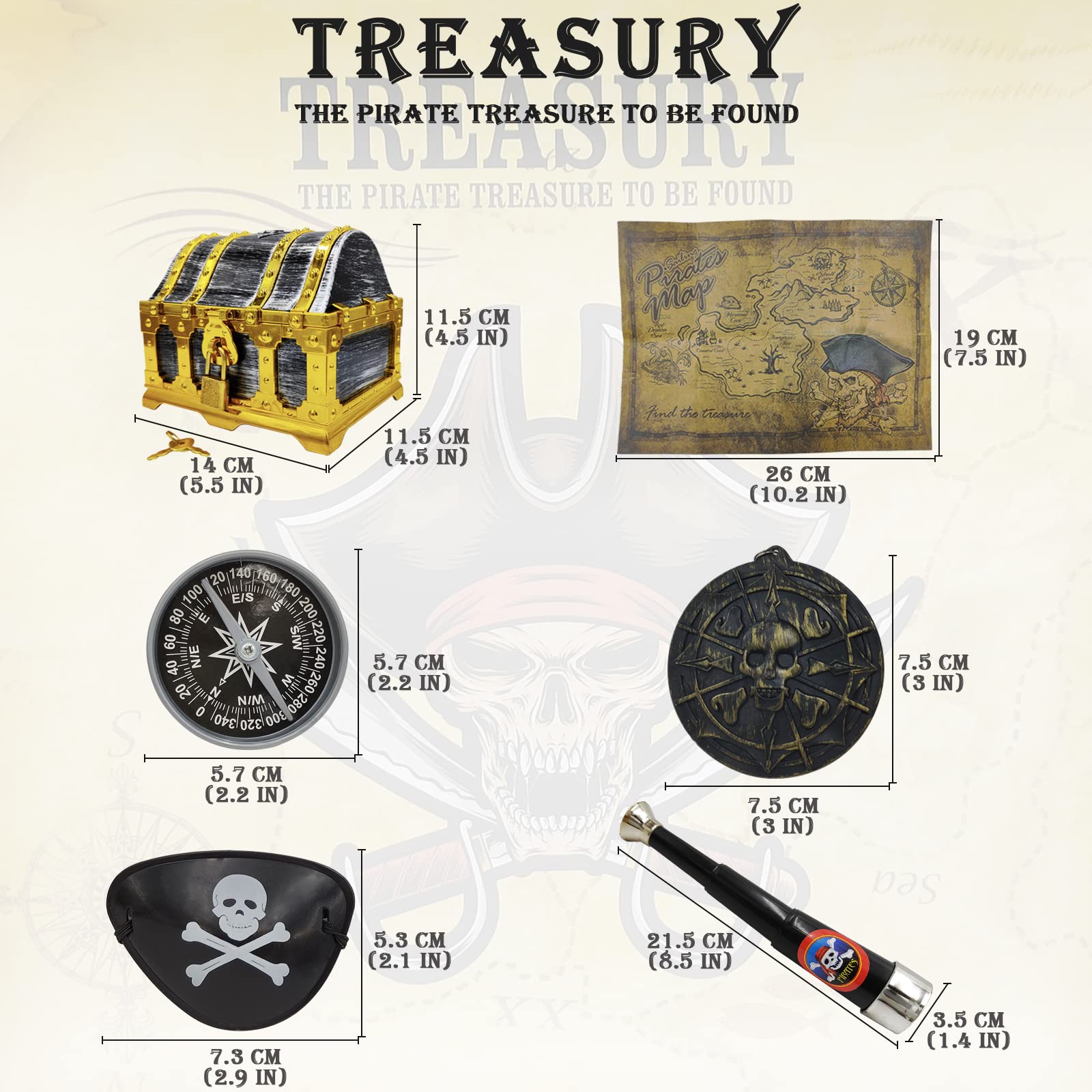 - Q: What items are included in the pirate treasure chest set? A: The set includes a golden frame pirate treasure box, 50 imitation pirate treasure gems, 50 plastic gold coins, 16 pieces of pirate play money, and various accessories like a pirate map, compass, and eye patches.