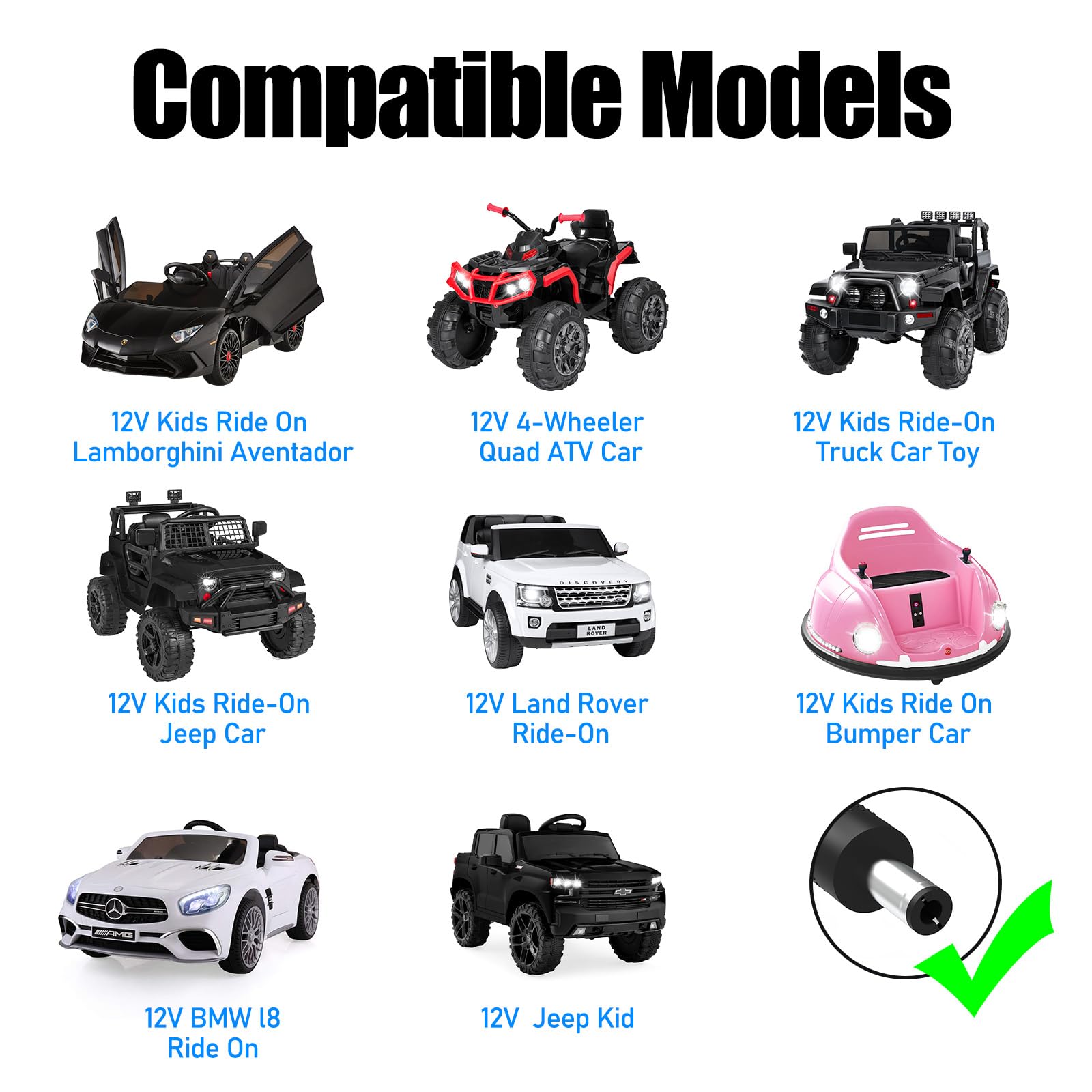 - Q: What types of ride-on toys is the 12V battery charger compatible with? A: The 12V battery charger is compatible with a variety of ride-on toys including models from Best Choice Products, Razor E90, E95, mx125, as well as Power Wheels, Jeep Cars, Ferrari, Lamborghini, Mercedes Benz, and BMW.