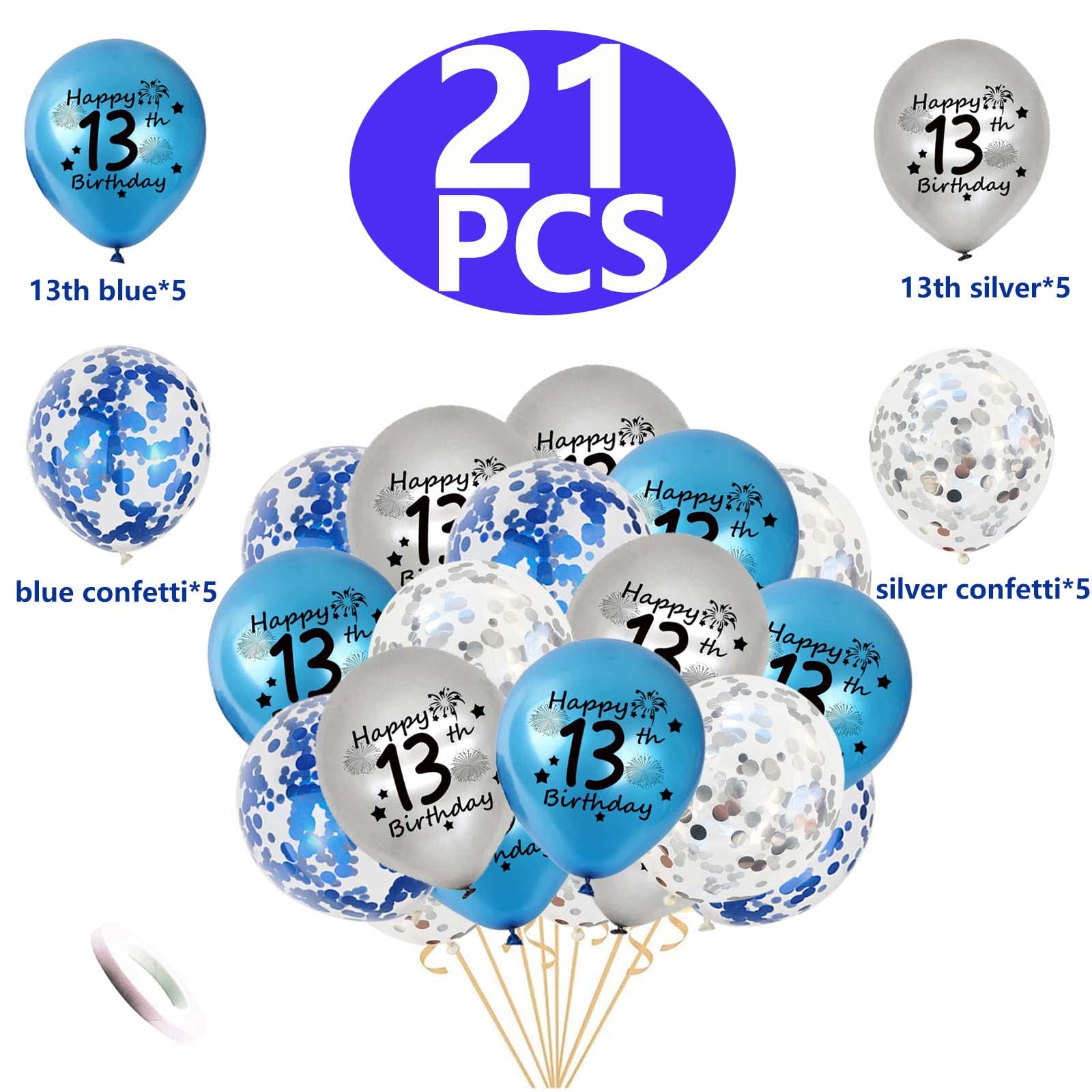 - Q: What is included in the 13th Birthday Balloon pack? A: The 13th Birthday Balloon pack includes 10 happy 13th birthday latex balloons in blue and silver, 5 silver confetti balloons, 5 blue confetti balloons, and 1 white ribbon, totaling 21 pieces.