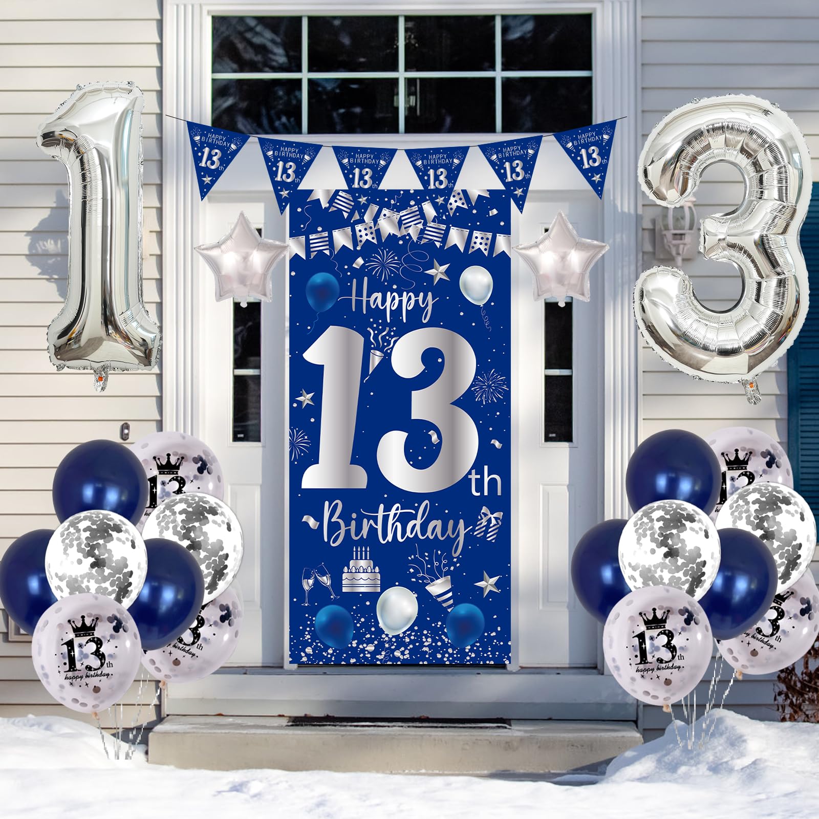 - Q: What items are included in the 13th birthday decorations set? A: The set includes a triangle flag banner, a 59 x 27 inch 'Happy 13th Birthday' door banner, a 32 inch number 13 foil balloon, 15 navy blue latex balloons (10 inch), 10 silver confetti balloons (12 inch), 6 silver birthday printed confetti balloons (12 inch), and 2 star balloons (18 inch).