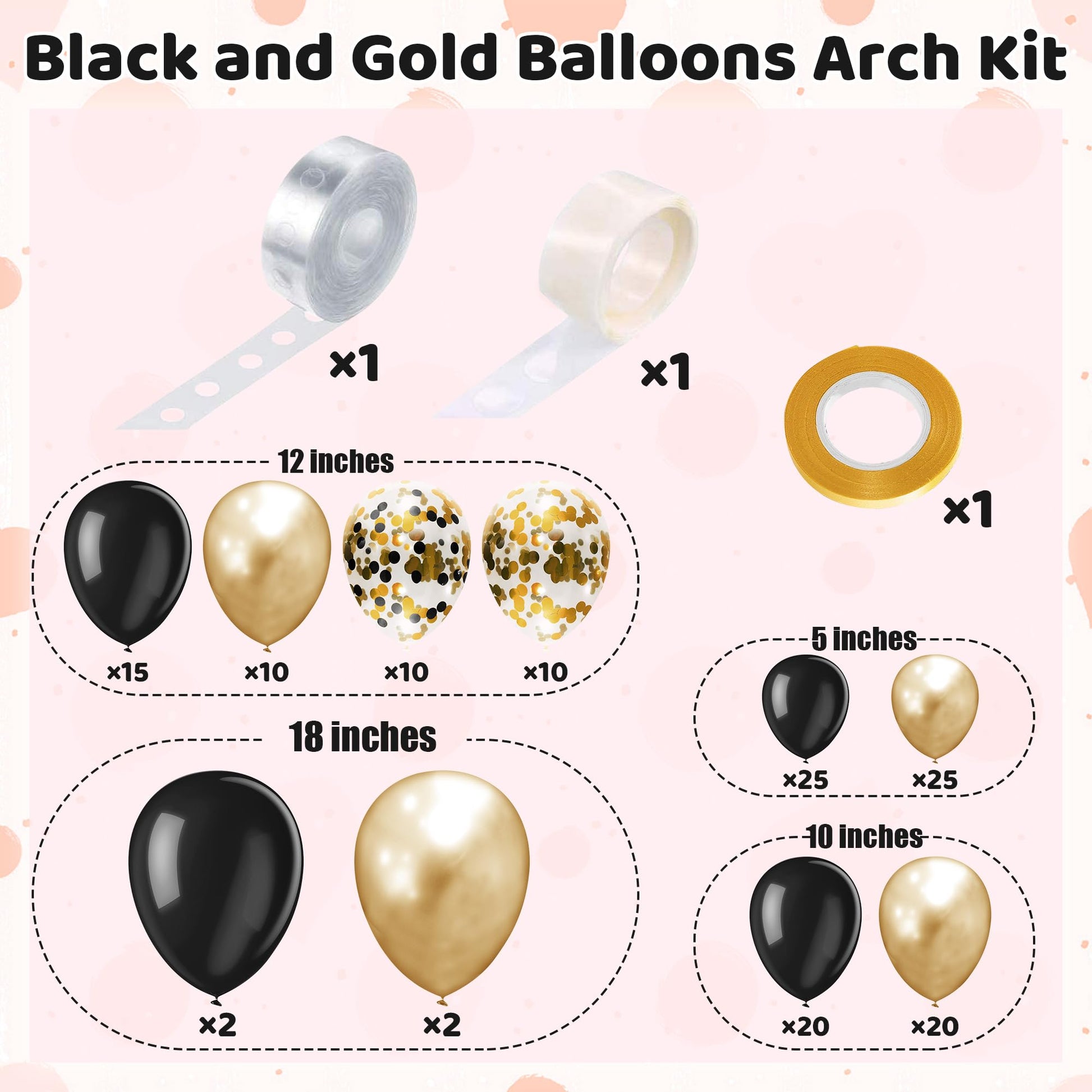- Q: What sizes of balloons are included in the Black and Gold Balloon Garland Arch Kit? A: The Black and Gold Balloon Garland Arch Kit includes a variety of balloon sizes: 50 pieces of 5-inch balloons, 40 pieces of 10-inch balloons, 45 pieces of 12-inch balloons, and 4 pieces of 18-inch balloons.