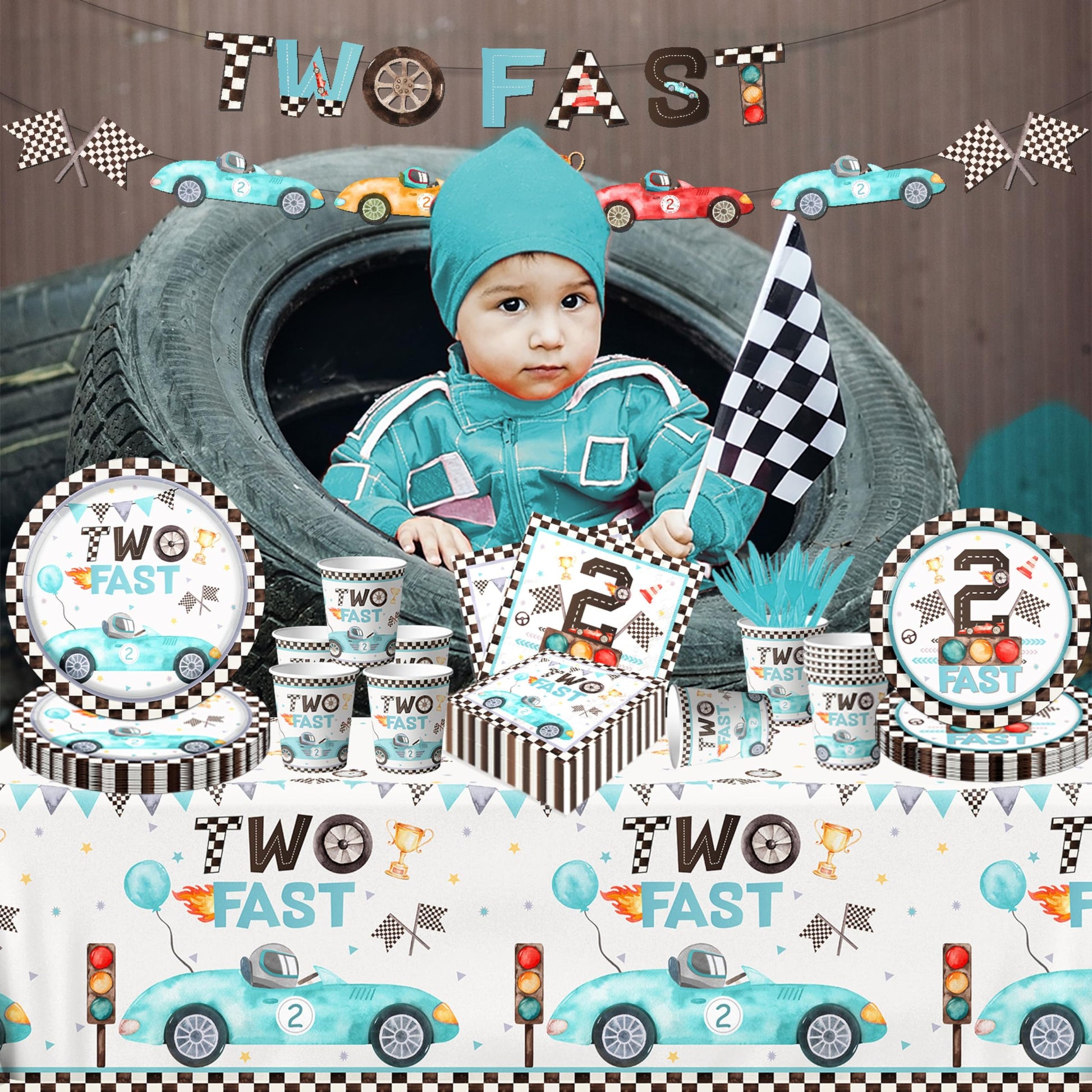 - Q: What is included in the 142pcs Two Fast Birthday Party Tableware set? A: The set includes 1pc 'Two Fast' banner, a race car tablecloth, 40 disposable paper plates in 2 sizes, 20 paper cups, 40 napkins, 20 knives, and 20 forks, catering to the needs of 20 guests.