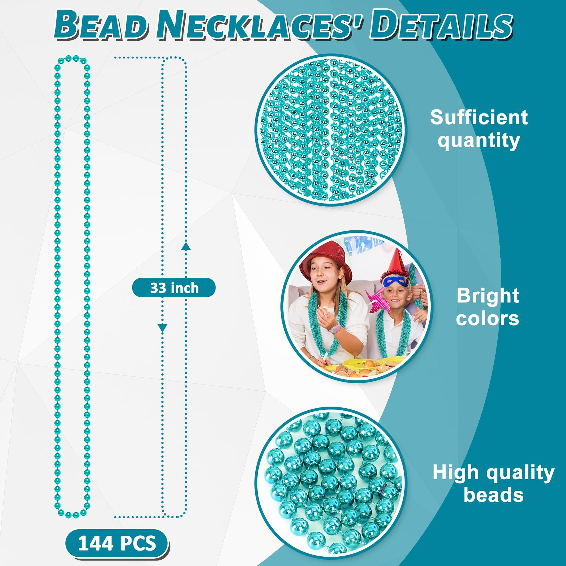 144PCS Mardi Gras Beads, Lake Blue Mardi Gras Rose Necklaces Bulk, Metallic 33'' Mardi Gras Round Beaded Necklace Stuff, Festiva