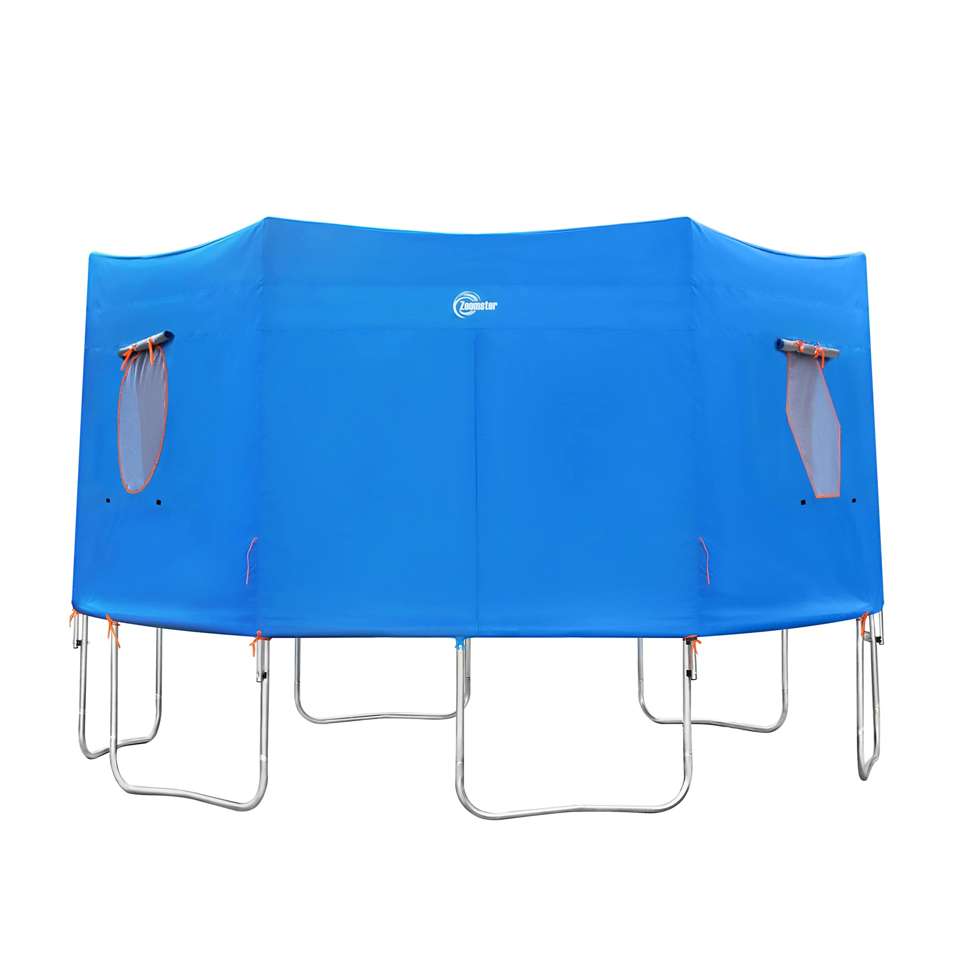 Trampoline Tent Color: Blue Size: Fits for 14FT TrampolineFits for 6 Straight Pole Round TrampolineMaterial: Durable Oxford fabric The tent protects your kids from moisture, bug bites, and heat from direct sunlight. It has three screen windows. Each window has an adjustable cover that you can set according to your needs. Each window is given in a different direction, allowing better air circulation inside. Front Entrance with Zipper Allow Easy Entry and Exit. The tent is weather-resistant and UV-resistant, It provides club fun for kids.