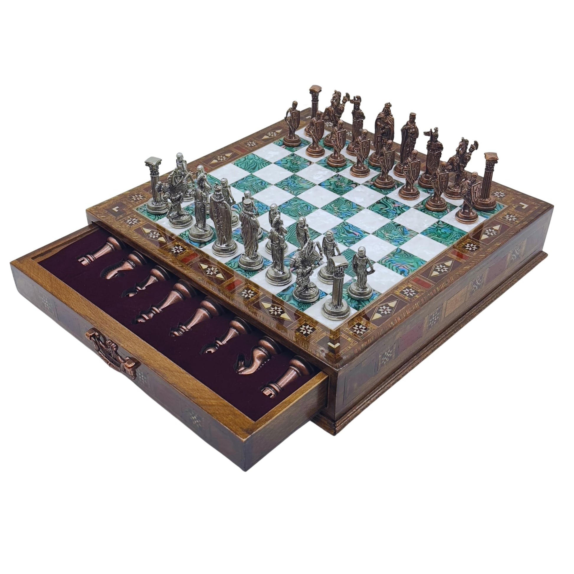 15 Handmade Chess Set With British Army Metal Chess Pieces, Luxury Storage Chess Board, For All Ages, Ideal For Father, (Green)