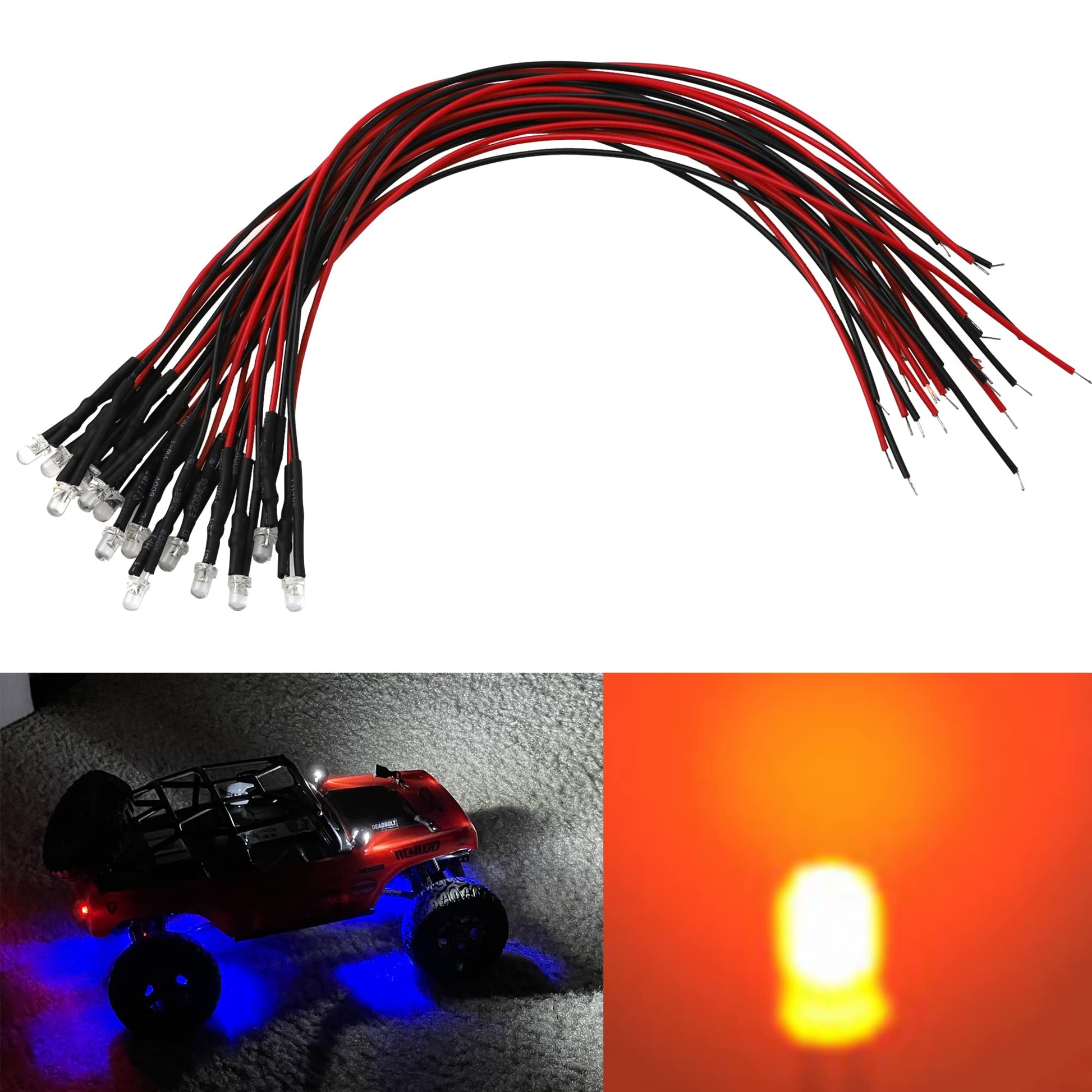 Note: 1.Please check the led lights size before you buying. 2.Make sure you have the spare receiver port. If you do not have the spare receiver port,you can DIY a 6V battery pack as the power supply. 3.The color of the item may vary slightly due to photography and your own computer /Phone. Universal RC led light emitting diodes, suitable for 1/10 1/8 crawler car truck. Compatible with 1/10 1/8 Traxxas Trx-4 Trx4 axial SCX10 II 90046 D90 RC4WD D110 RC crawler car truck; make your RC car more cool and attractive. These pre-wired LED beads can be used in automobiles, motorcycles, signal flasher, toy cars, remote control aircraft, model flasher, and other luminous beads that require product function indicator. Super bright, so you can play your RC car at drak night or in low light areas. Please connect the red wire to the positive terminal and the black wire to the negative terminal. Easy to install and durable. Material: Metal + Plastic Pre-wired Diode Length: 20cm/7.87in Working Voltage: 12V Maximum Current Limit: 20mA Total Weight: 3mm: 18 g; 5mm: 21 g Roof Led Color Map: Led Light Color: 3mm White/3mm Red/3mm Yellow/3mm Blue/3mm Green/5mm White/5mm White/5mm Yellow/5mm Blue/5mm Green(Optional) Led Quantity: 15 Pcs Package Contents: 15 x LED Light Emitting Diodes