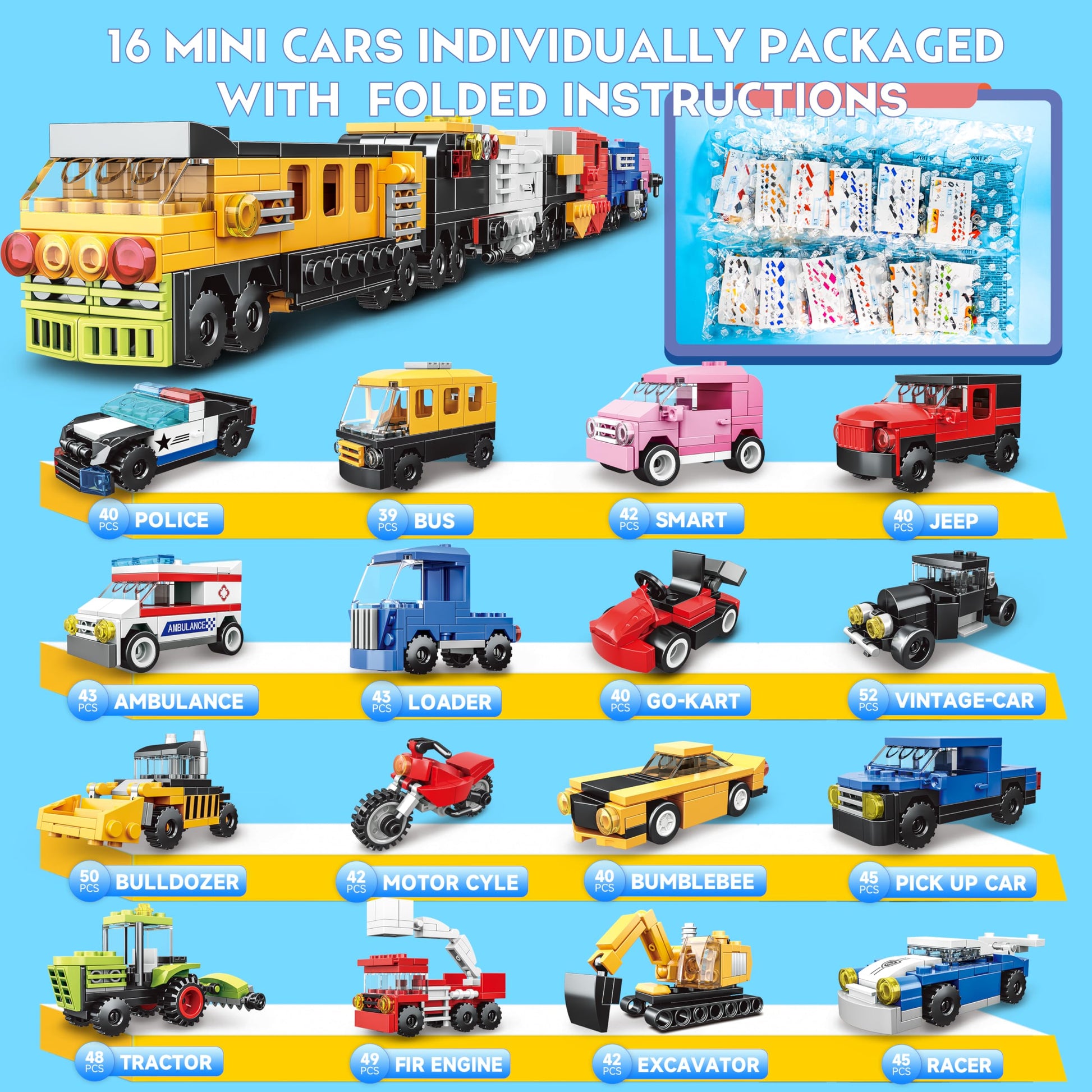 Cars Vehicles Party Fovrs For Kids - Building Kit Create 16 Unique Cars Or Train, Construction & Emergency & City Vehicles, 710Pcs Building Toys Perfect For Party Goodie Stuffers Gifts For Boys Girls