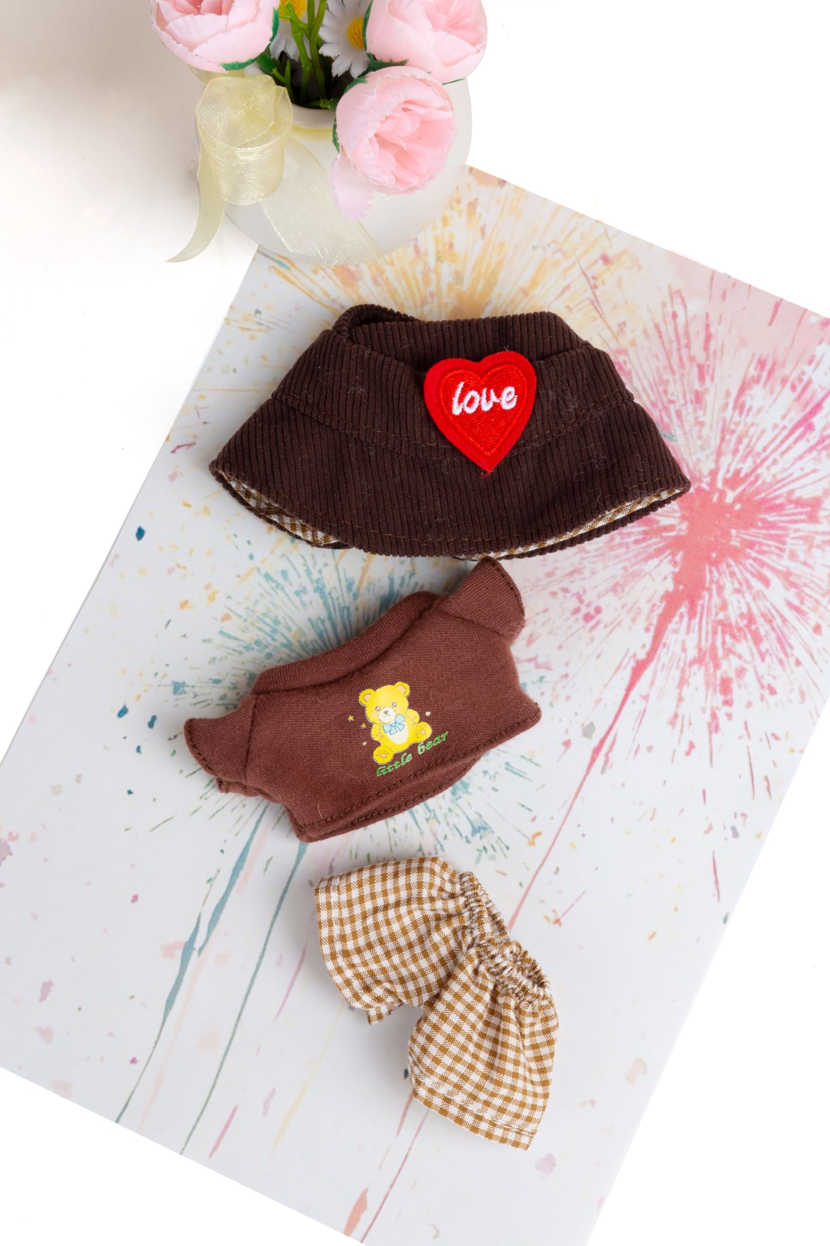 17 cm Doll Clothes 3-Piece Set Stylish Clothes for 17cm Doll enhanced Outfit with Accessories for Doll- Red Heart Brown Hat & Brown Bear Tshirt & Coffee Plaid Pants (NO Doll)