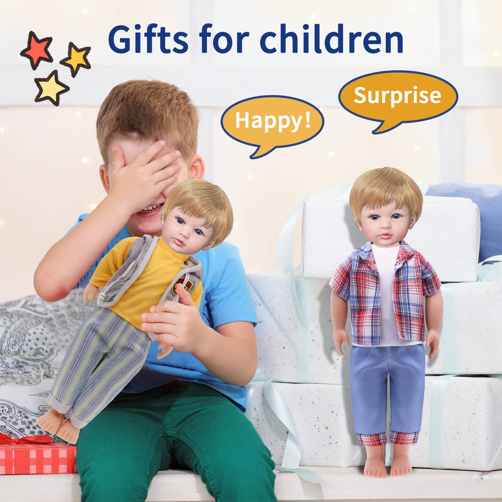 - Q: What size dolls are compatible with these 18 inch boy doll clothes? A: These doll clothes are designed to fit 15 to 18 inch dolls, including 16 inch baby dolls, 17 inch newborn dolls, and 18 inch boy dolls.