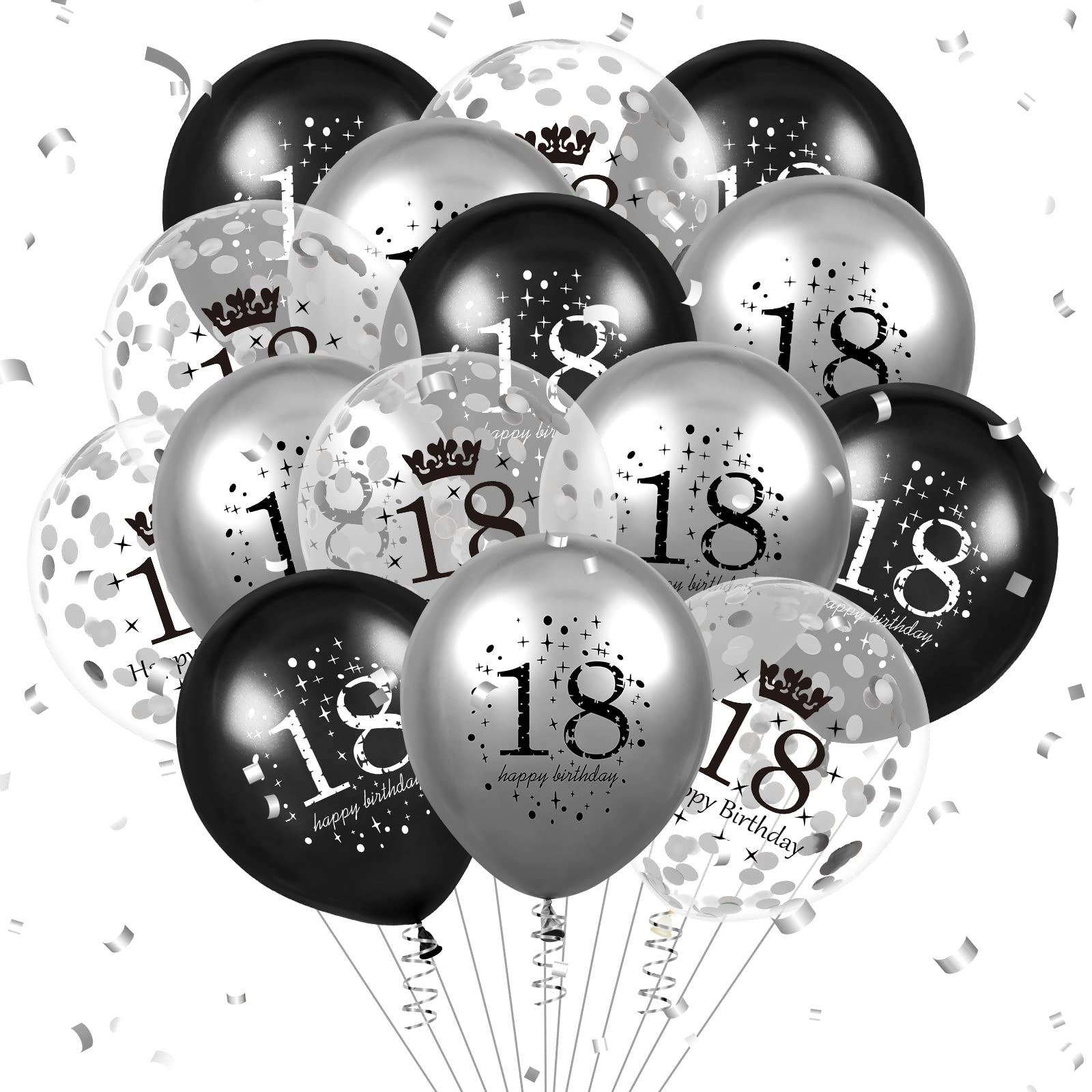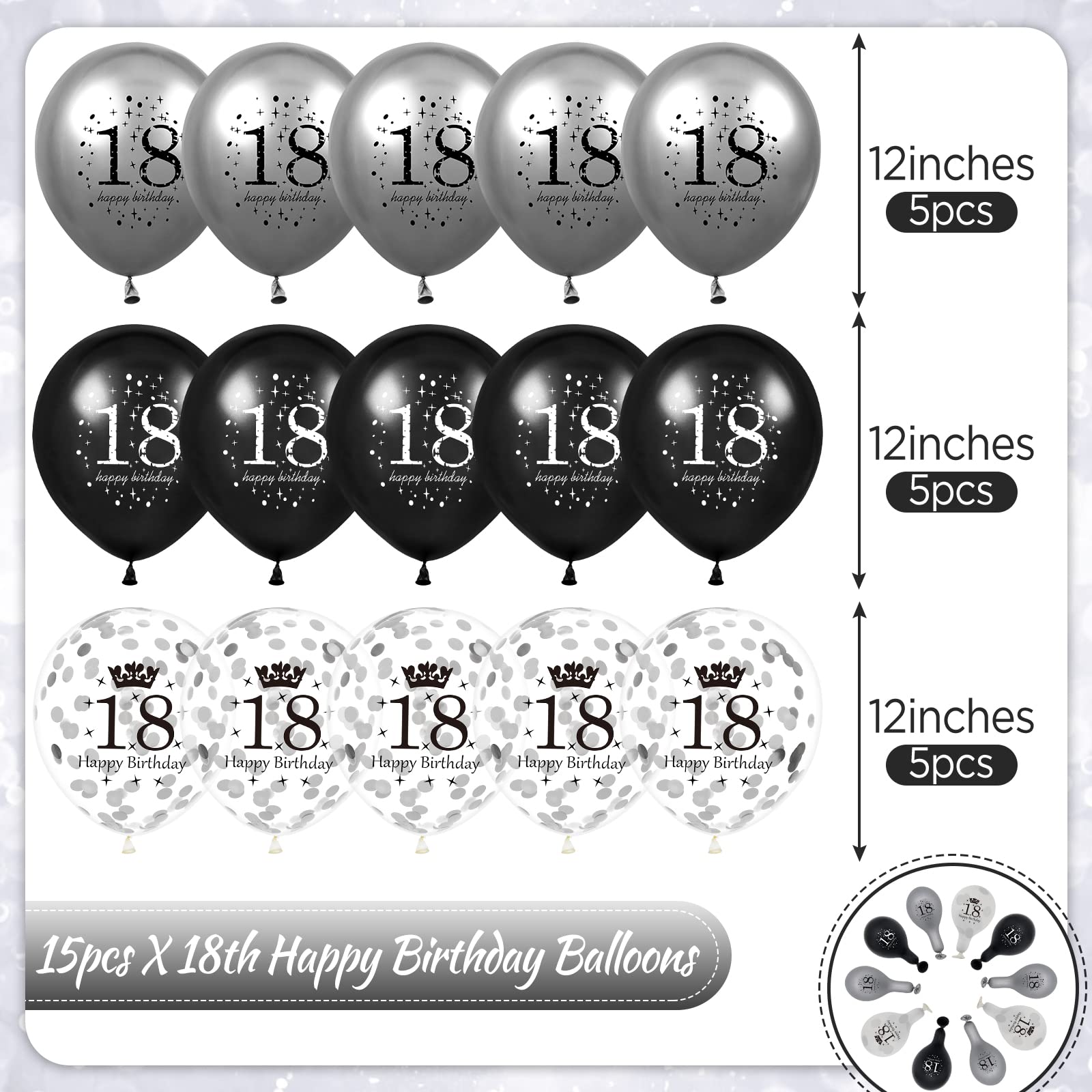 - Q: What are the dimensions and quantity of the 18th birthday balloons? A: The 18th birthday balloons are 12 inches in size and come in a pack of 15 pieces, which includes 5 black balloons, 5 silver balloons, and 5 silver sequins balloons.