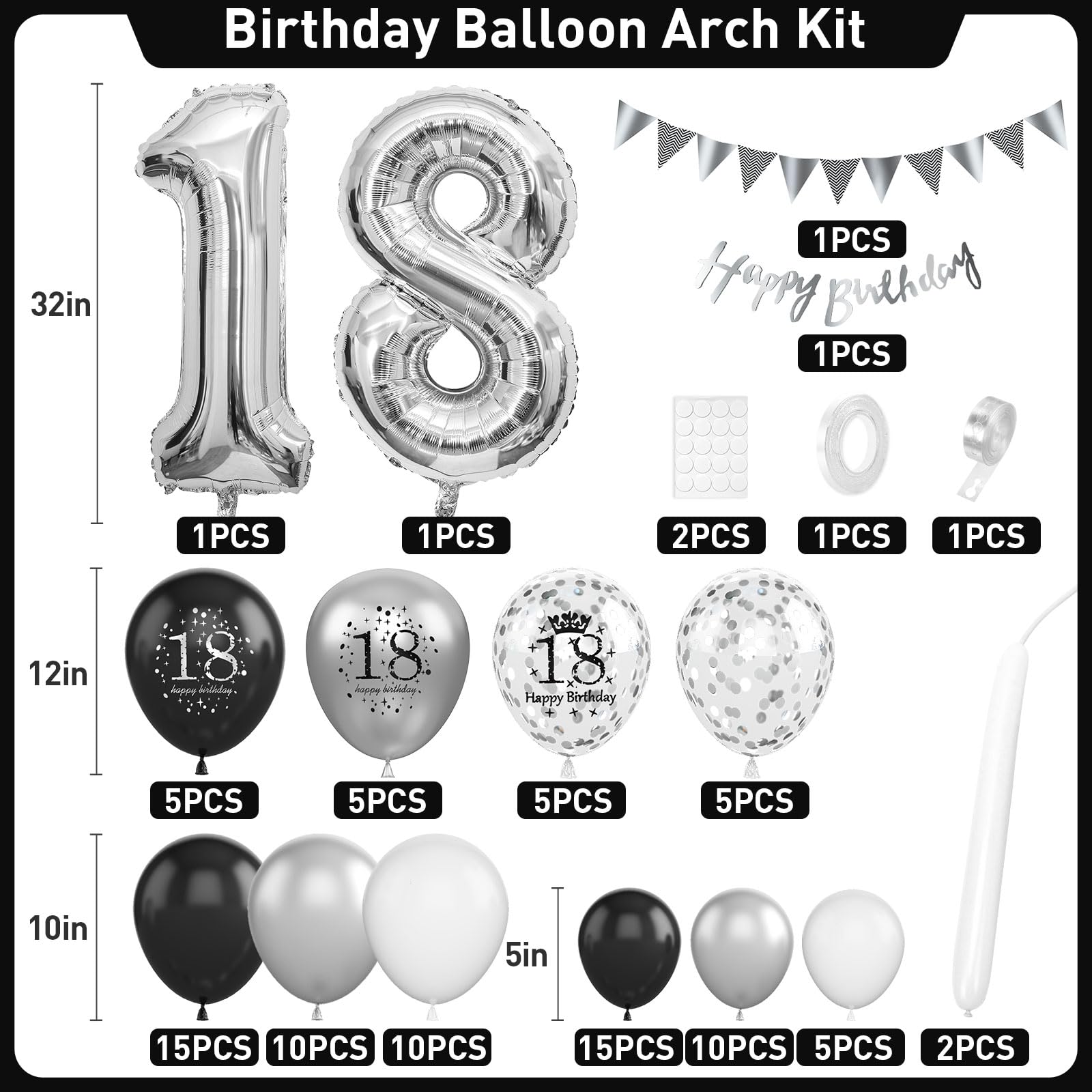 - Q: What items are included in the 18th birthday decorations set? A: The 18th birthday decorations set includes 1 'HAPPY BIRTHDAY' banner, 1 silver triangle flag, a 32-inch '18' foil balloon, 30 black balloons (5 and 10 inches), 20 metallic silver balloons (5 and 10 inches), 15 white balloons (5 and 10 inches), 15 12-inch '18' balloons in black and silver, 5 silver confetti balloons, 2 long balloons, glue, a balloon strip, and a ribbon.
