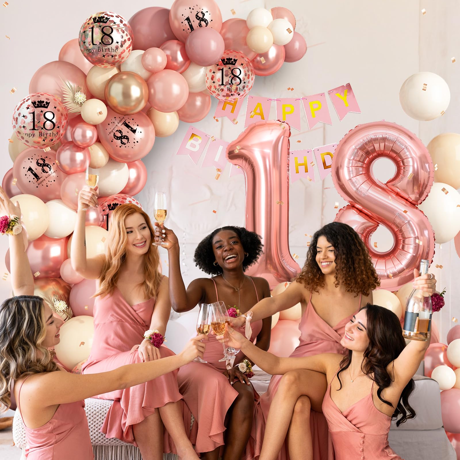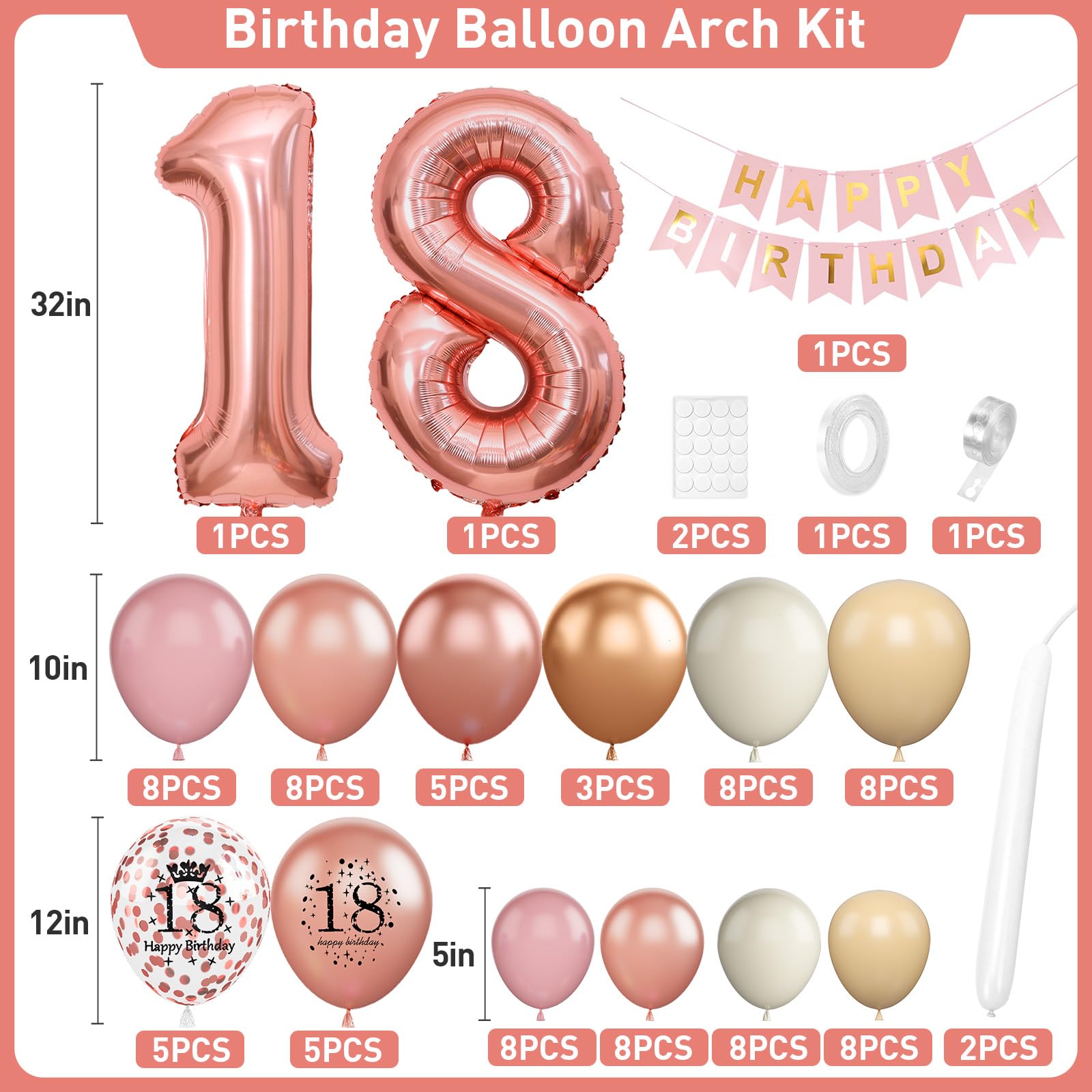 18Th Birthday Decorations For Girls,Rose Gold 18Th Birthday Balloon Arch Garland Kit With Happy 18Th Birthday Number 18 Foil Balloons,Happy Birthday Banner For 18Th Birthday Party Decoration