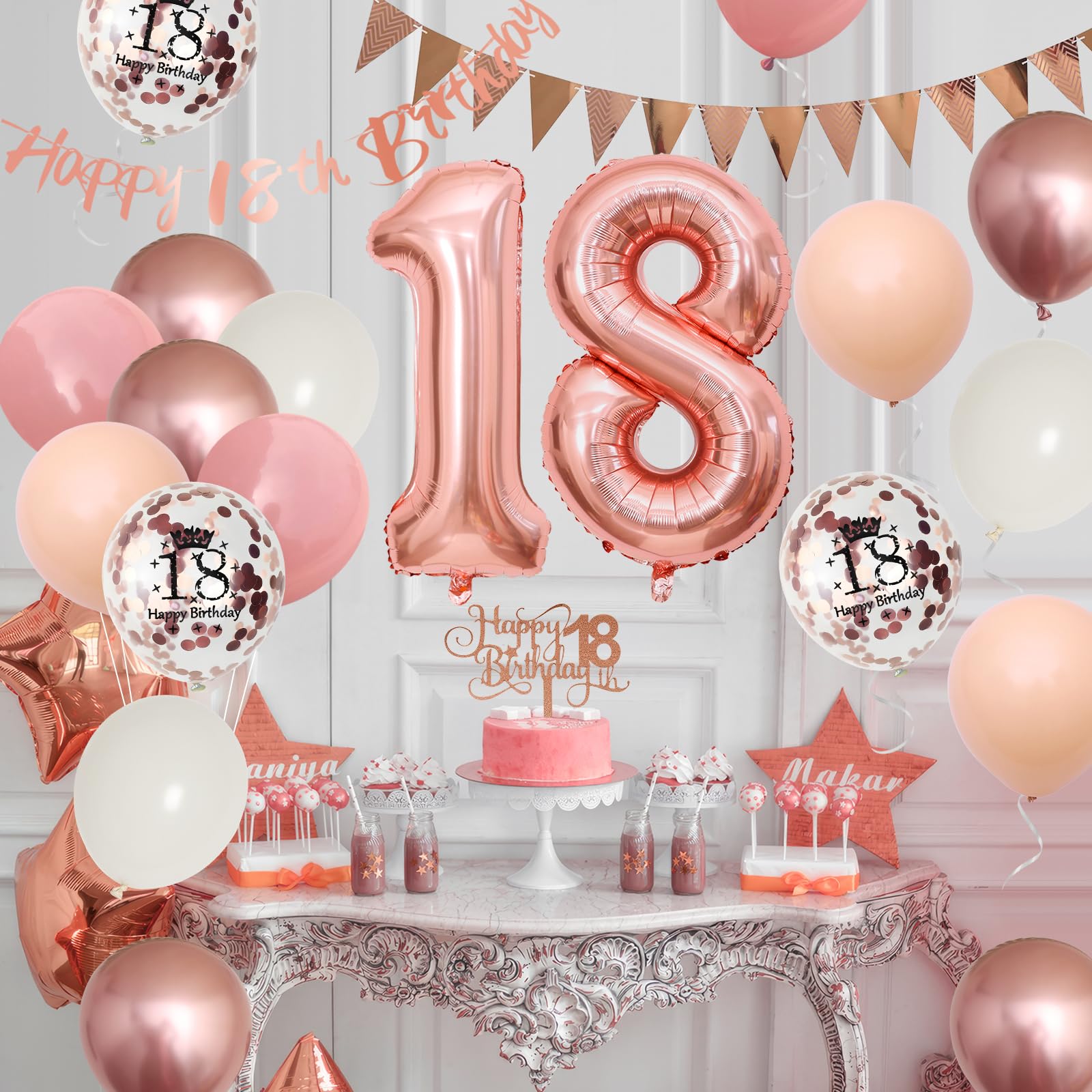 • Q: What decorations are included in the 18th Birthday Decorations set? A: The set includes a rose gold happy 18th birthday banner, a rose gold triangle flag banner, a number 18 foil balloon, a happy 18th cake topper, and a variety of balloons including retro blush pink, rose gold metallic, sand white, confetti, and apricot balloons.