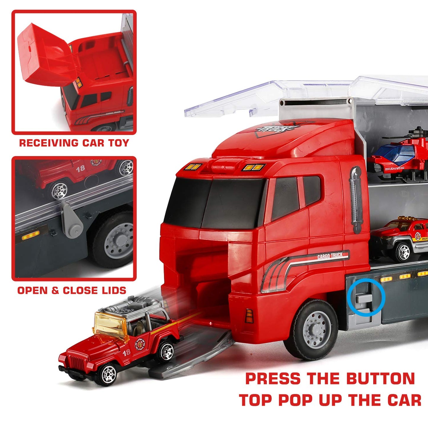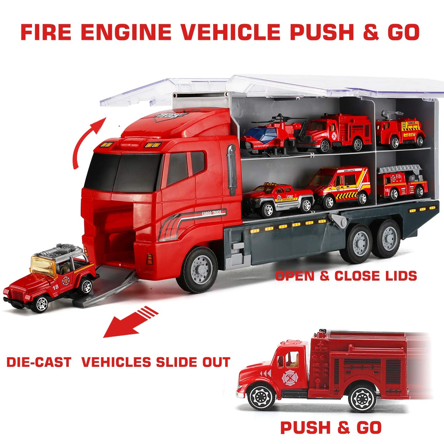 19 Pcs Fire Truck with Firefighter Toy Set, Mini Die-cast Fire Engine Car in Carrier Truck, Mini Rescue Emergency Double Side Tr