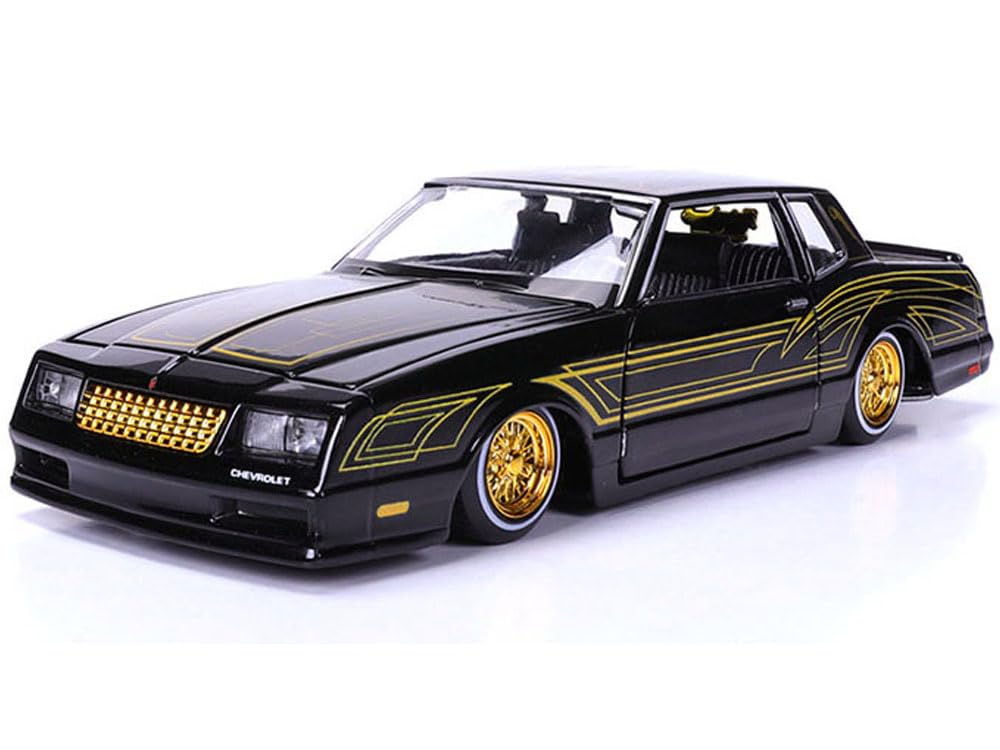View compare1986 Chevy Monte Carlo Ss Lowrider Black Metallic With Gold Graphics And Wheels Lowriders Series 1/24 Diecast Model Car By Maist