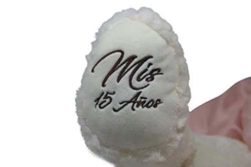 For those that are looking for something other than a doll... we now have the option of a Beautiful Elegant Quince Bear Centerpiece. These bears measure 20 long. Crme color, soft and cuddly, dressed in an elegant, glamorous gown. Unique with long curled lashes. The bust of the dress is decorated with sequins and the skirt is made up with multiple layers of tulle and satin. The right leg of the bear is embroidered with Mis 15 Aos. Complete and accessorized with a little rhinestone tiara, earrings, and matching color wrist bouquet.