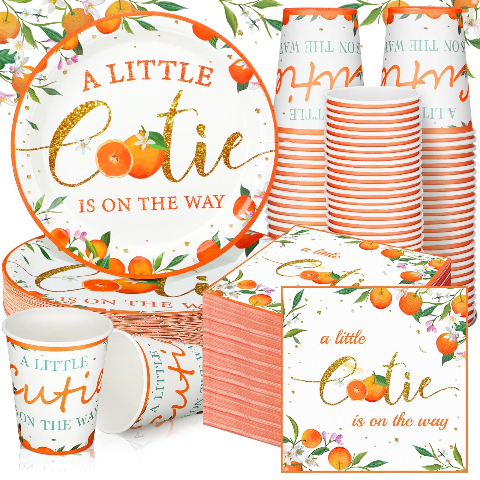 200 Pcs Little Cutie Baby Shower Paper Plates Napkins Cups Orange Baby Shower Party Supplies Tableware Set Orange Disposable Cup
