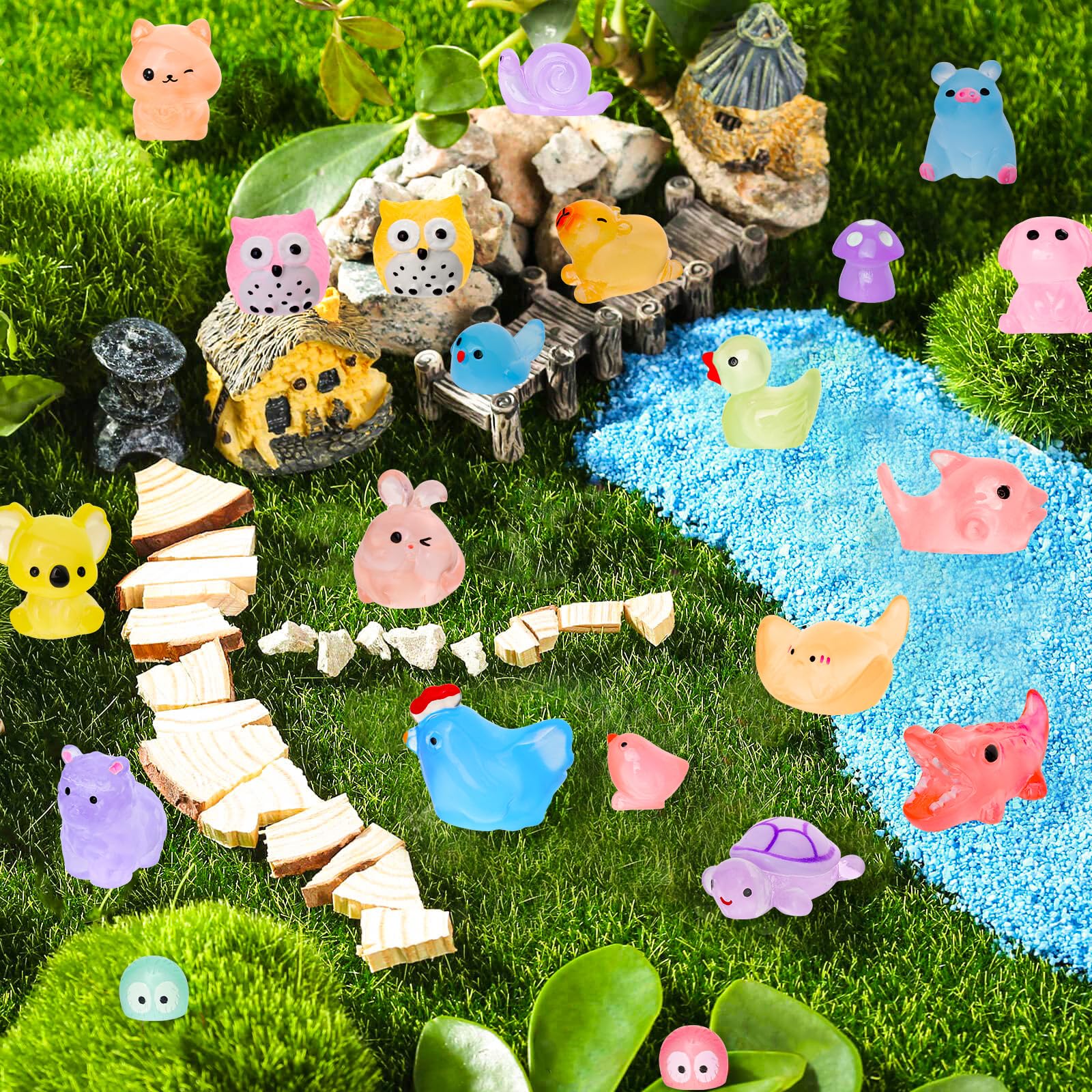 200pcs Luminous Mini Resin Animals 30 Types Miniature Resin Animal Figurines to Hide Bulk Glow in The Dark Tiny Ducks Frogs Small Cat Bunnies for Fairy Garden Micro Landscape Dollhouse Accessories