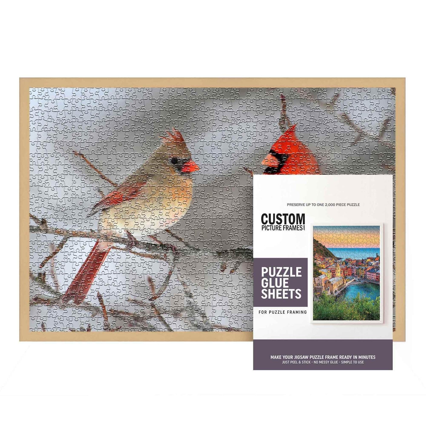 • Q: Does the product include anything for preserving the puzzle before framing? A: Yes, the kit comes with a set of peel and stick puzzle glue sheets, allowing you to easily preserve and adhere your puzzle before placing it in the frame.